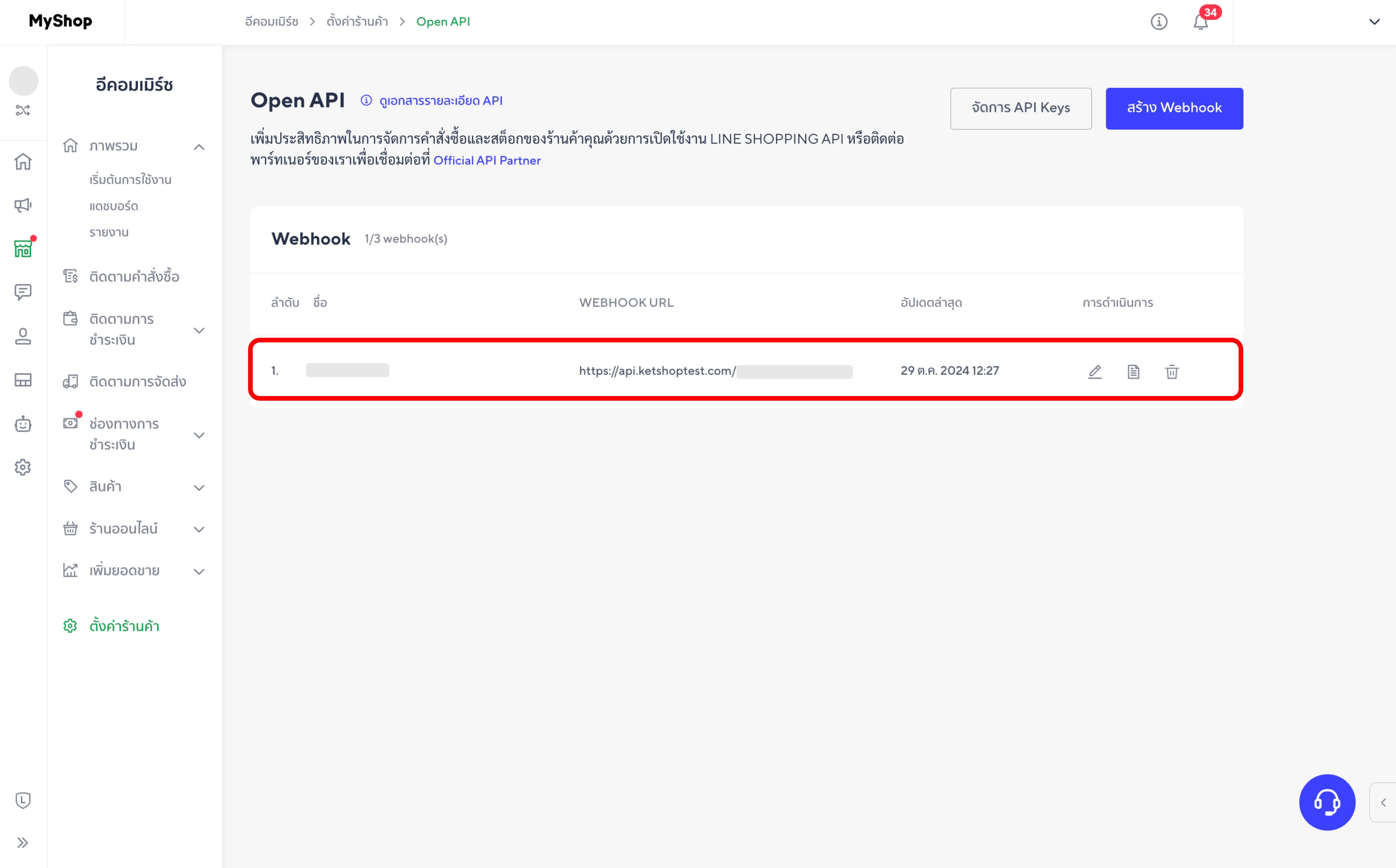 เมื่อทำการเชื่อมต่อระบบ Ketshopweb กับ Line Shopping แล้ว จำเป็นต้องใช้ Webhook ในการดึงข้อมูลออเดอร์จาก Line Shopping มาที่ Ketshopweb ซึ่งร้านค้าต้องนำ webhook url ของ Ketshopweb ไปใส่ที่ร้านค้าบน Line Shopping ของคุณ โดยมีขั้นตอนดังต่อไปนี้