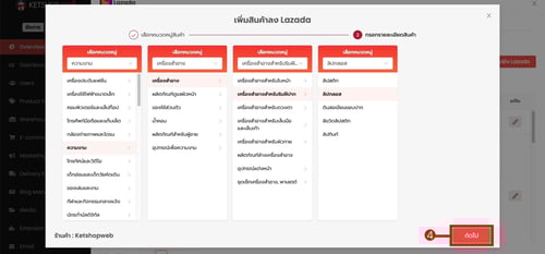 (ตำแหน่งที่ 4) เลือกหมวดหมู่สินค้าให้ครบทุกลำดับ จากนั้นคลิกที่ปุ่ม "ถัดไป"