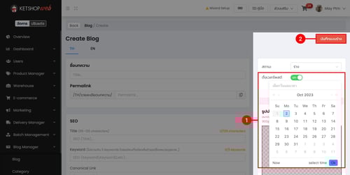 (ตำแหน่งที่ 1) เปิดใช้งานตั้งเวลาโพสต์ และเลือกวัน/เวลา ที่ต้องการให้เผยแพร่อัตโนมัติ
