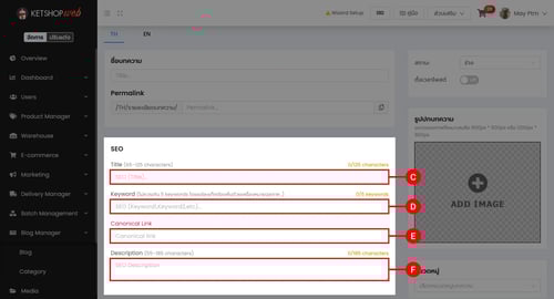 (ตำแหน่ง D) : Keywords คำค้นหาหลักของหน้า blog นั้นๆ ควรใส่จำนวนคีย์เวิร์ดที่เหมาะสมสำหรับเว็บไซต์