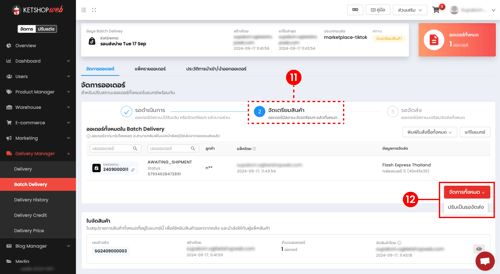 (ตำแหน่งที่ 12) คลิก “จัดการทั้งหมด” --> “ปรับเป็นรอจัดส่ง” เพื่อจองขนส่ง