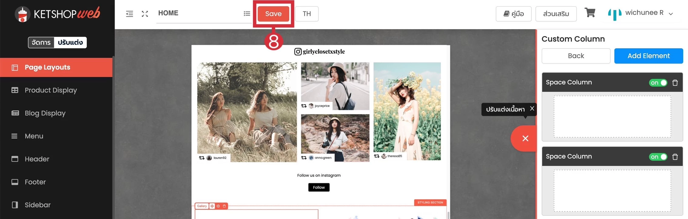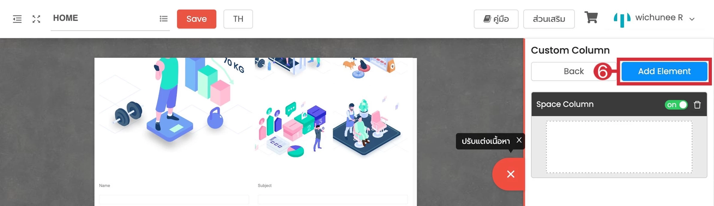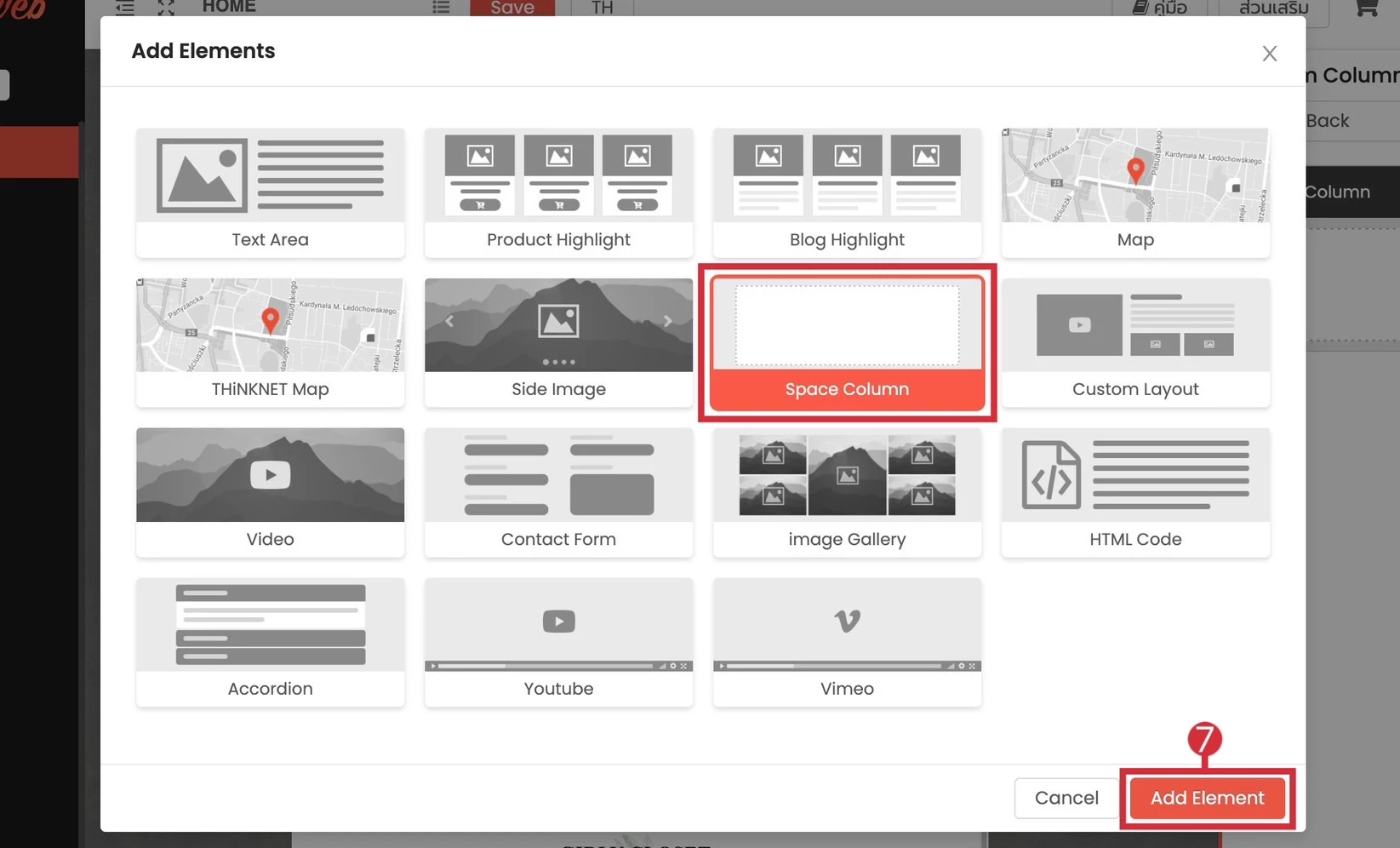 (ตำแหน่งที่ 7) เลือก Element ตามที่ต้องการ ตัวอย่างเลือก Space Column