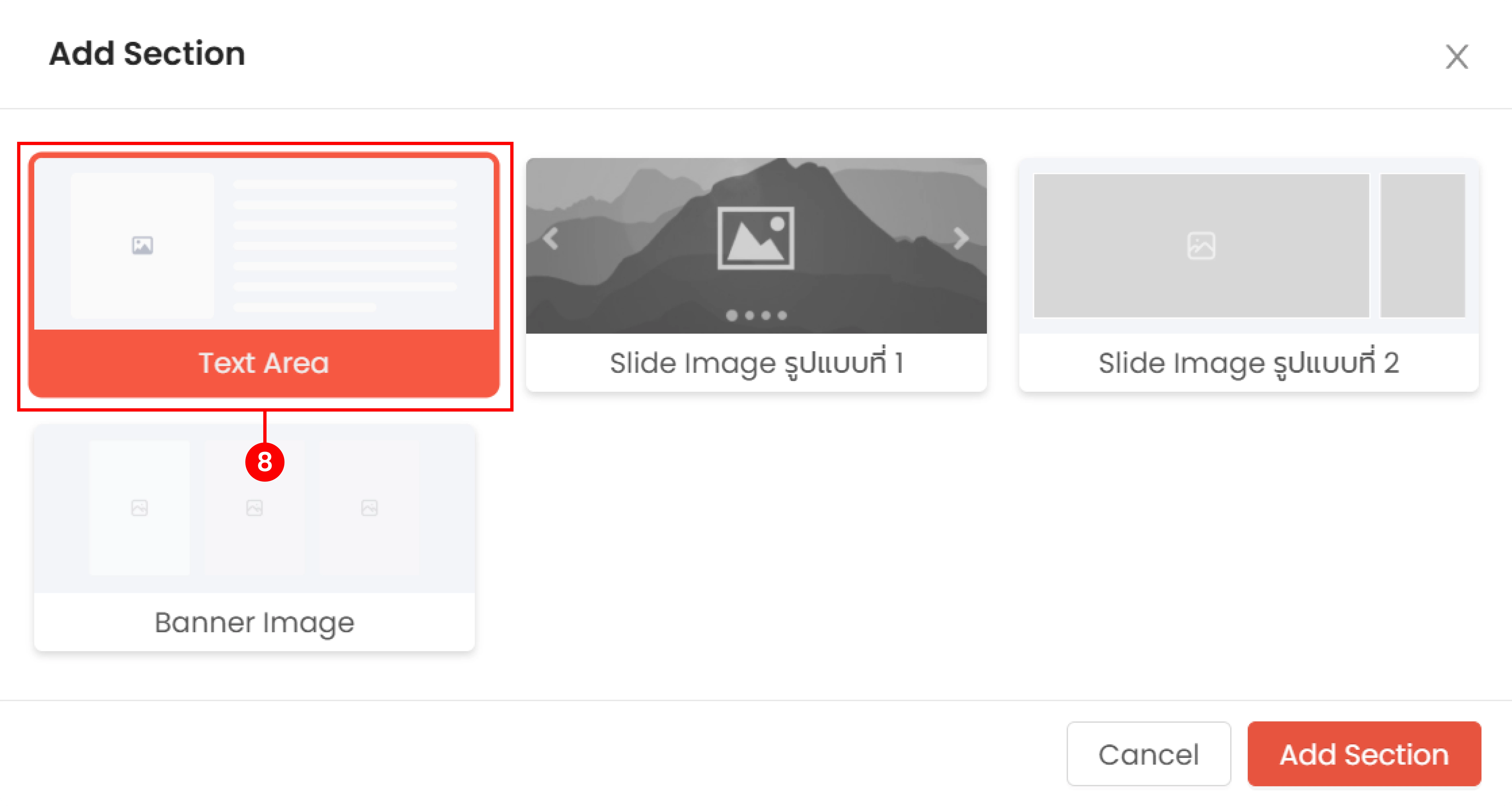 (ตำแหน่งที่ 8) คลิกเลือก Section "Text Area"