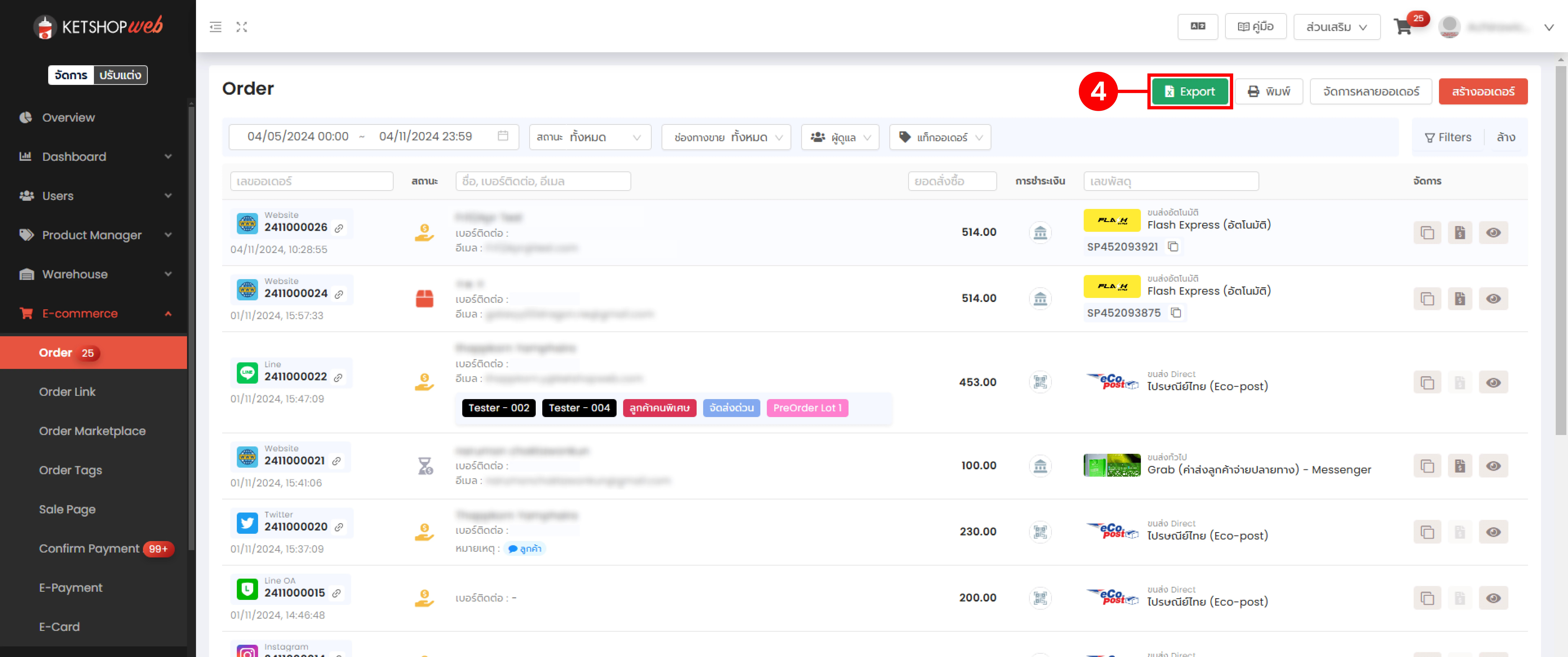 (ตำแหน่งที่ 3) เลือก Export ตามสถานะของออเดอร์