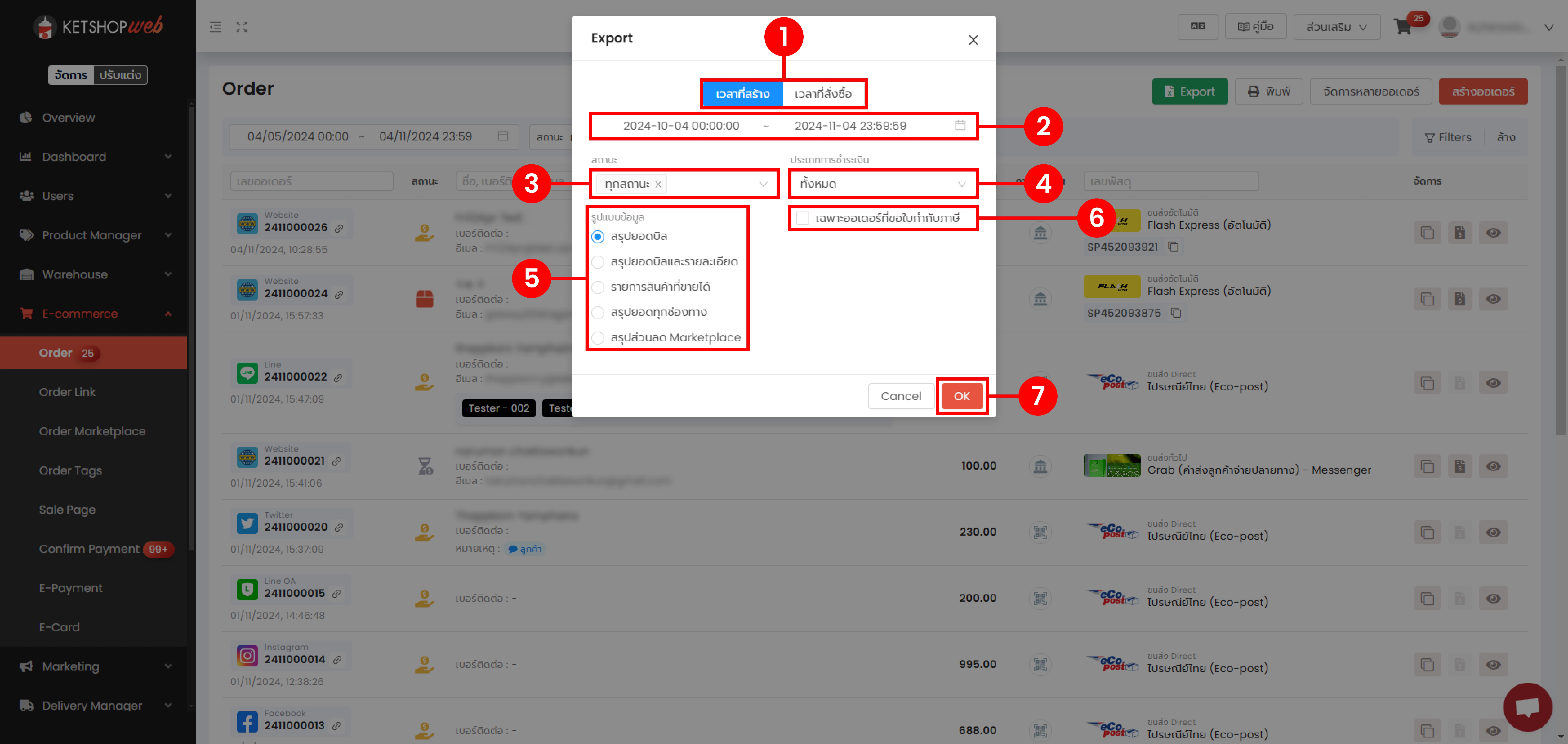 จะปรากฎหน้าต่างการ Export ข้อมูลออเดอร์ โดยมีรายละเอียดดังนี้