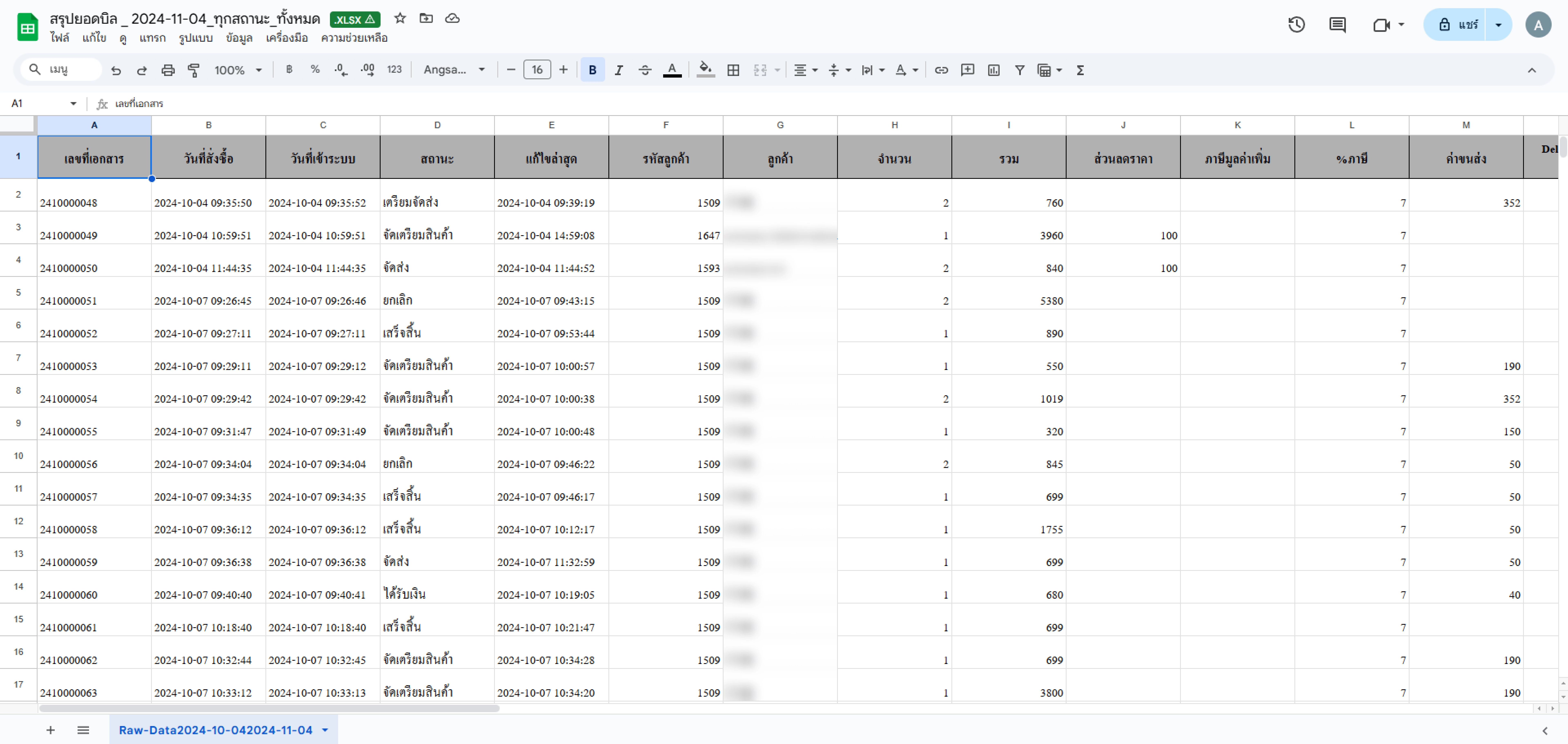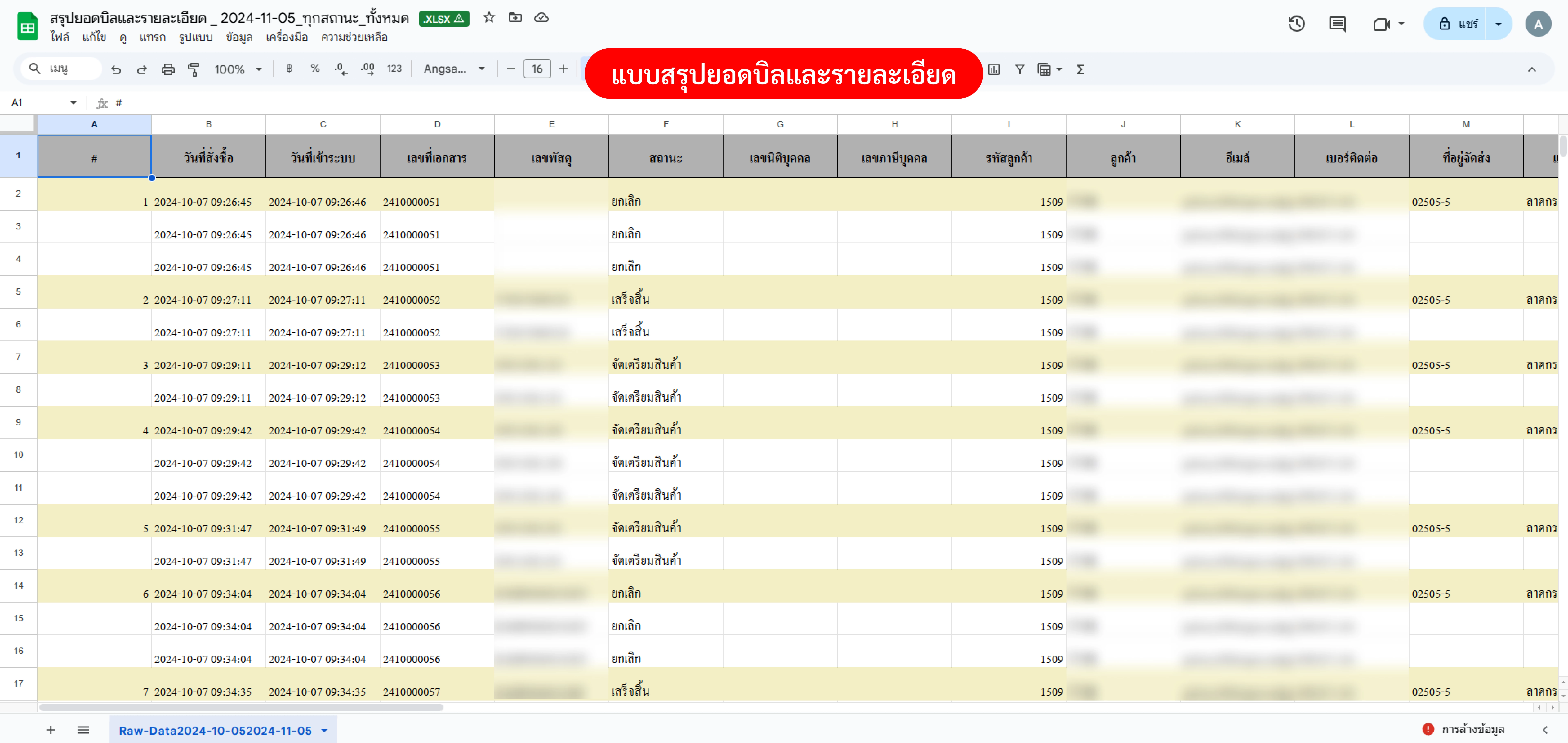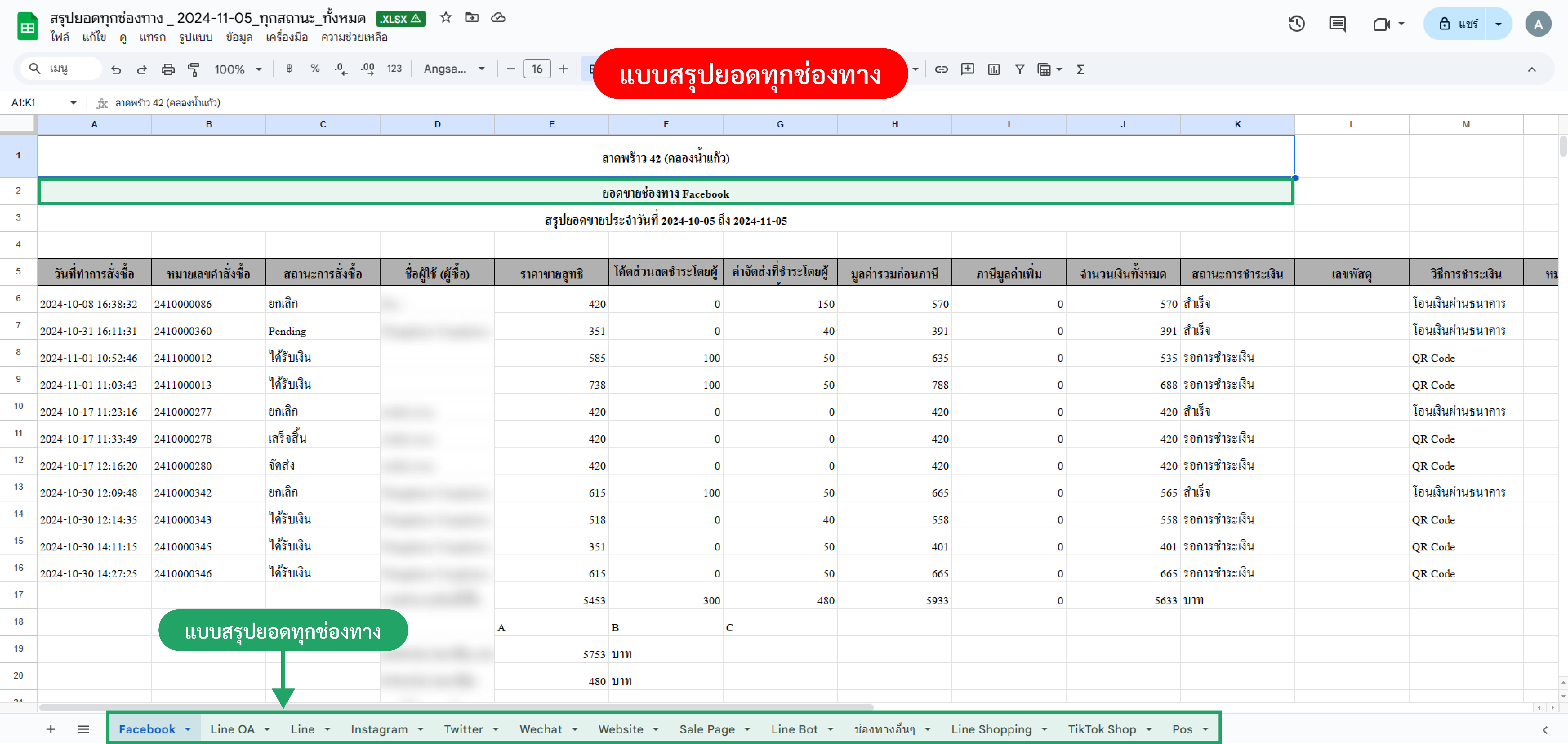 ตัวอย่างไฟล์ที่ Export แบบสรุปยอดทุกช่องทาง