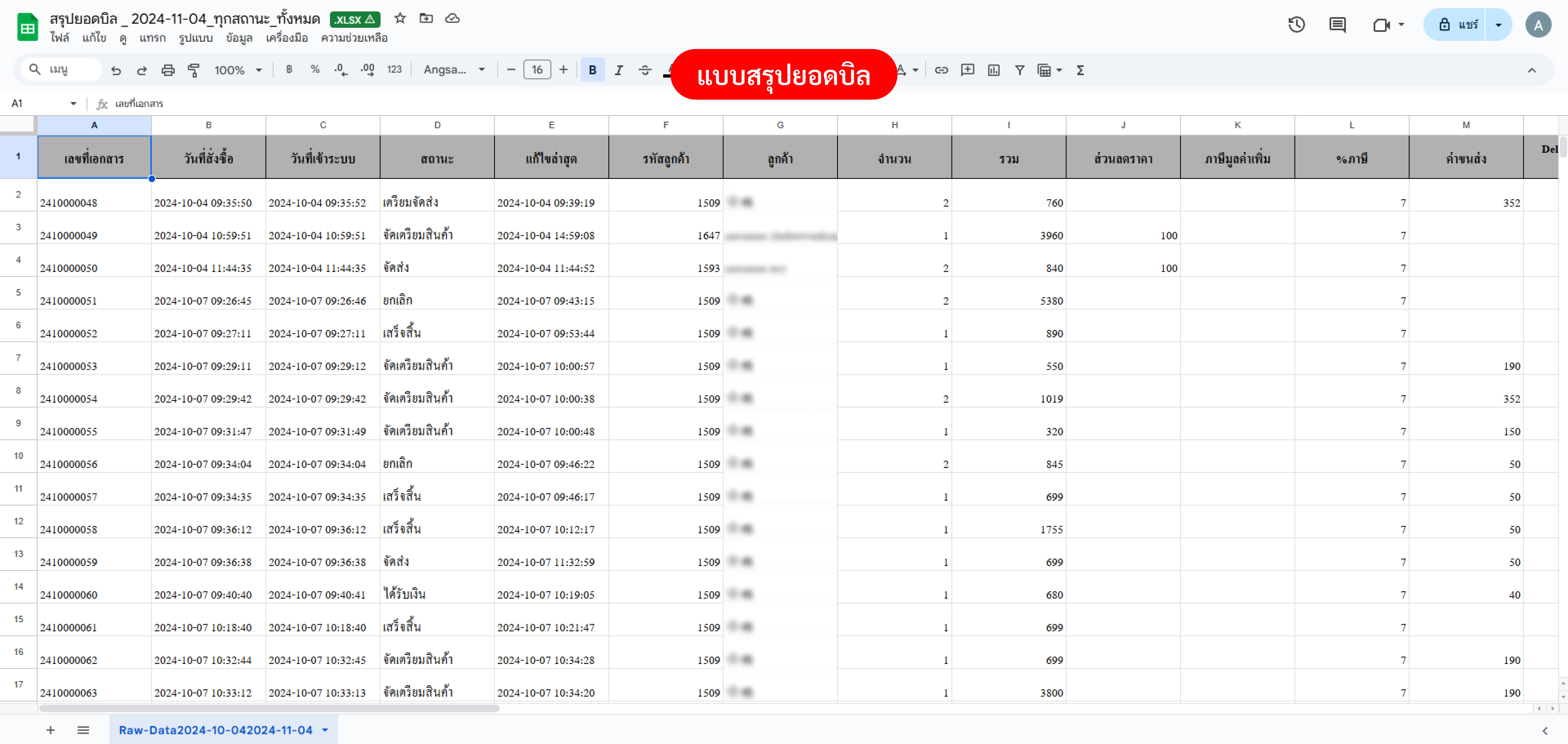 ตัวอย่างไฟล์ที่ Export แบบสรุปยอดบิล