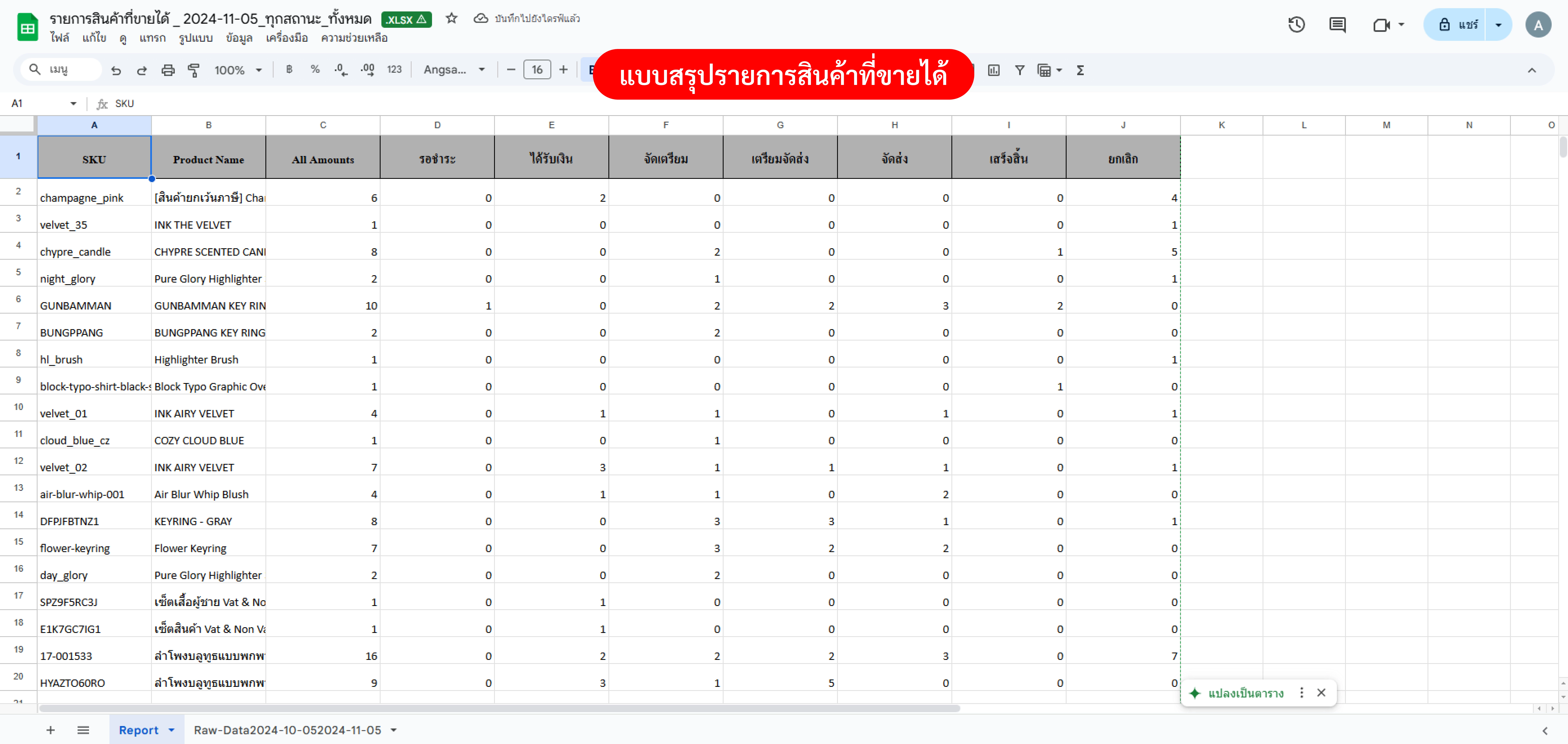 ตัวอย่างไฟล์ที่ Export แบบสรุปรายการสินค้าที่ขายได้