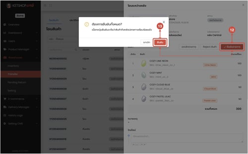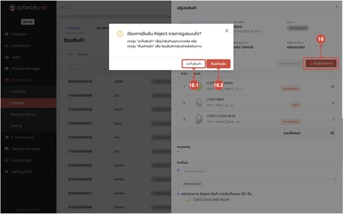 รายการปฏิเสธสินค้าจะสามารถกดยืนยันการปฏิเสธได้ก็ต่อเมื่อรายการโอน หรือรายการรับเข้าที่ถูกปฏิเสธถูกยืนยันแล้วเรียบร้อย (สถานะเป็นเสร็จสิ้น)