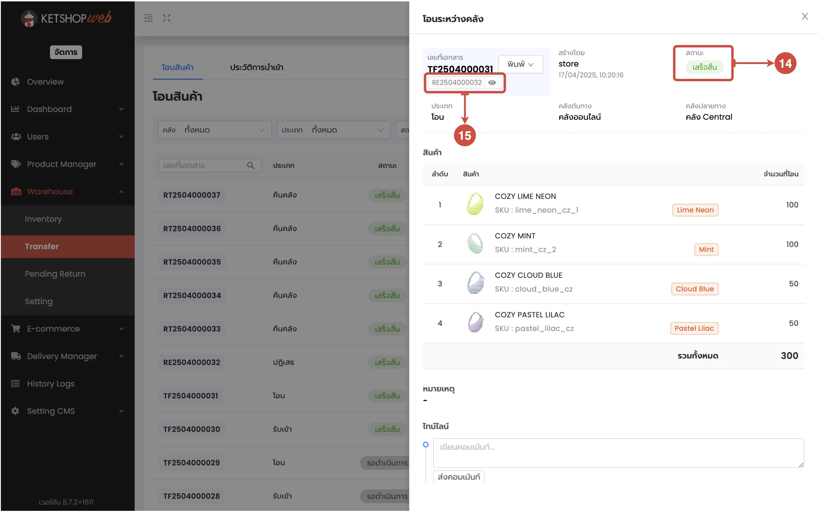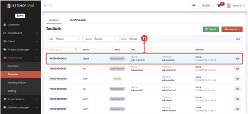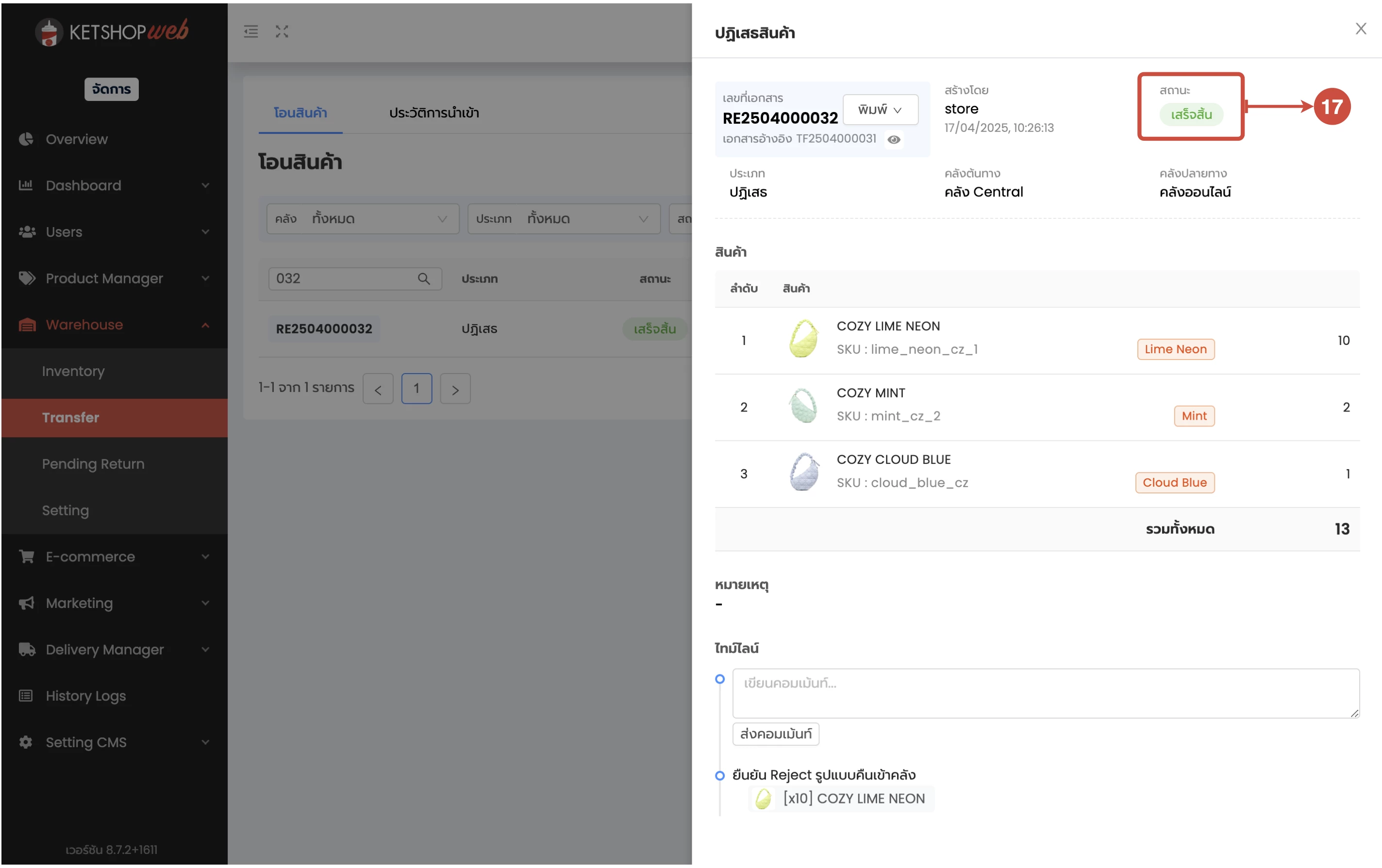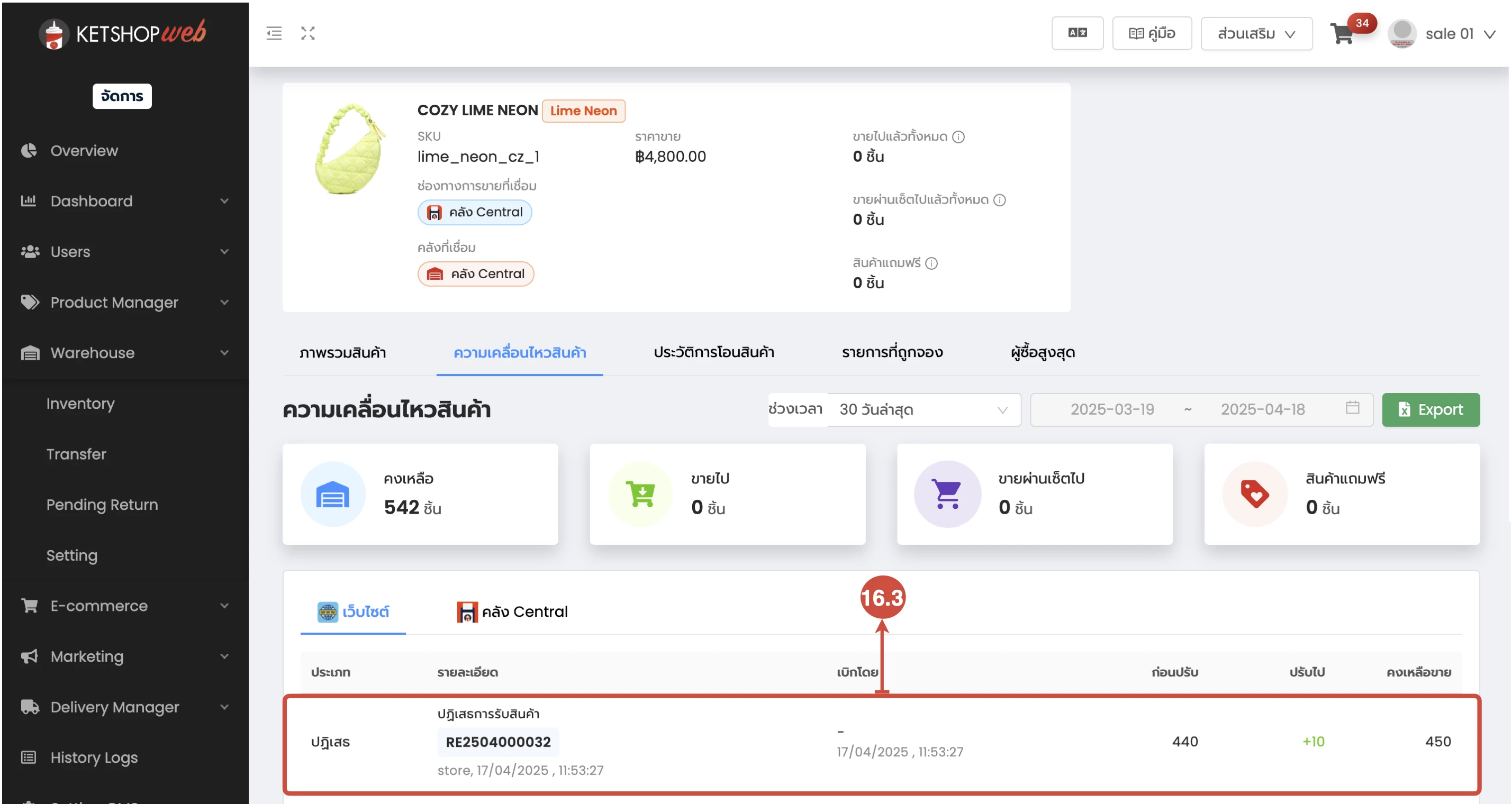 (ตำแหน่งที่ 16.3) กรณีเลือก 'คืนเข้าคลัง' ที่หน้าความเคลื่อนไหวสินค้ารายการสินค้าที่ถูกปฏิเสธ จะถูกคืนสต๊อกกลับเข้าคลังต้นทางดังรูป