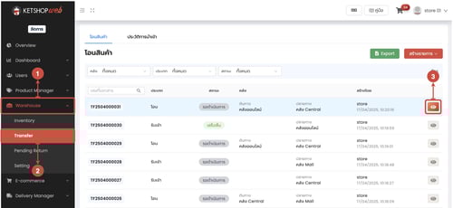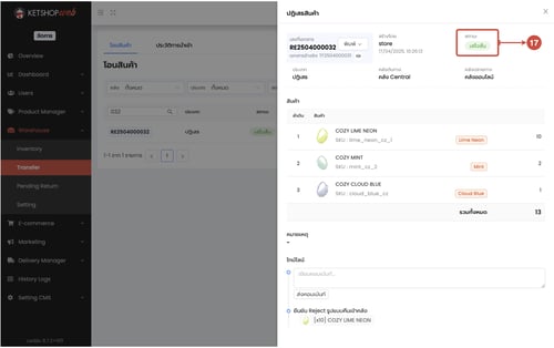 (ตำแหน่งที่ 16.2) กรณีคลิก 'คืนเข้าคลัง' รายการสินค้าที่ถูกปฏิเสธ จะถูกคืนกลับเข้าคลังต้นทาง
