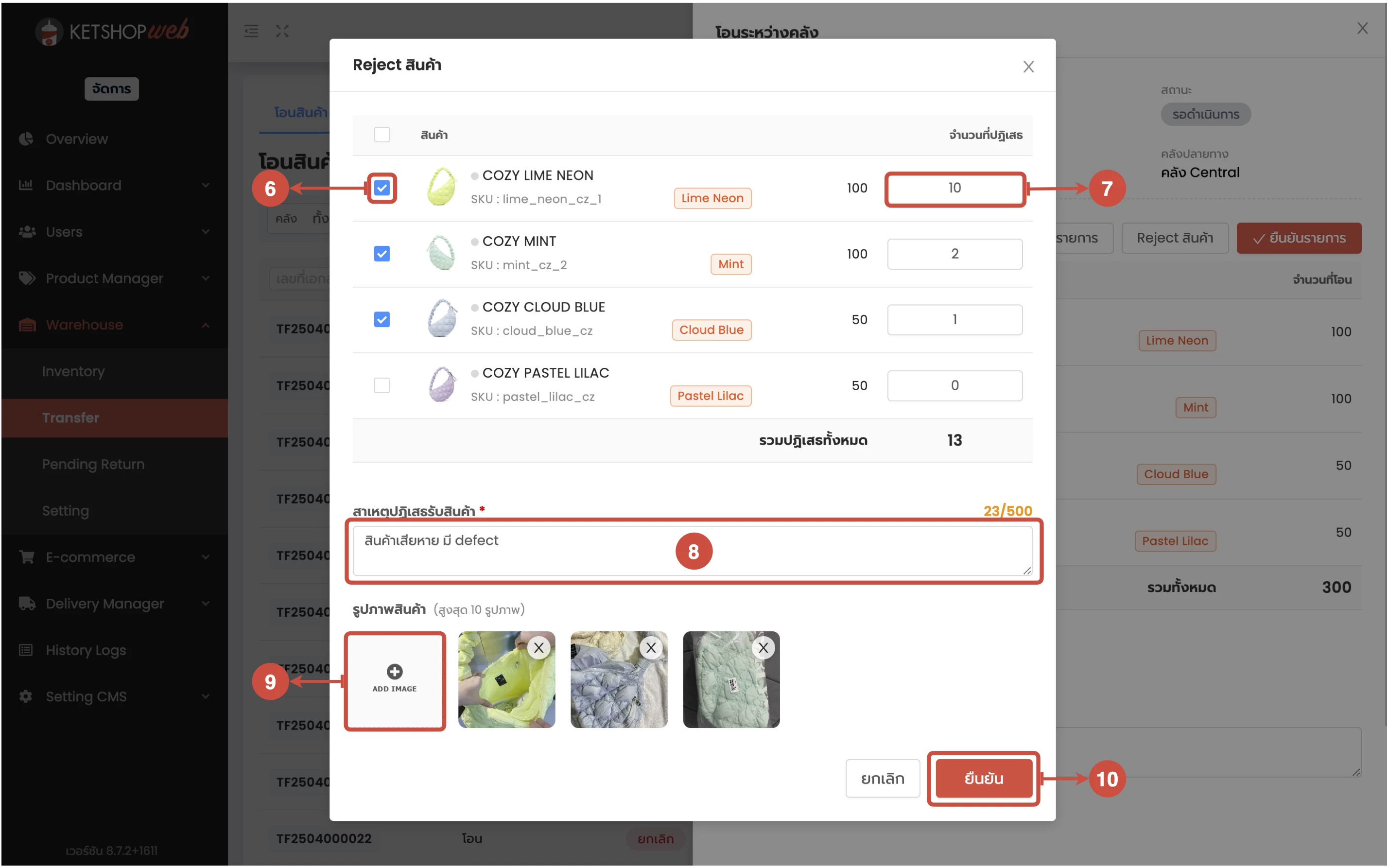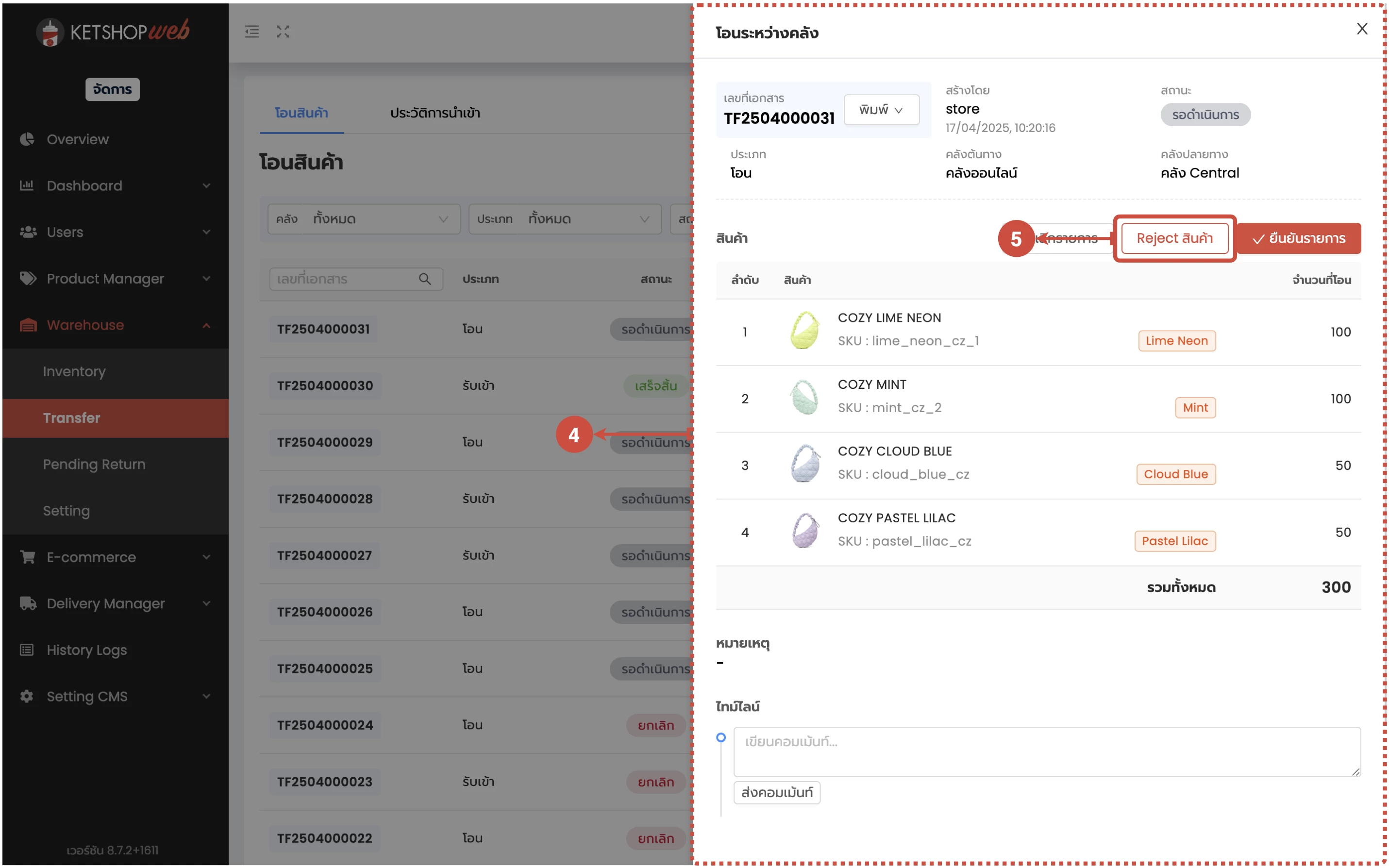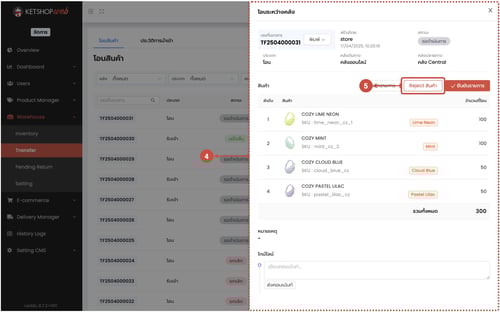(ตำแหน่งที่ 5) คลิกปุ่ม 'Reject สินค้า' เพื่อเลือกสินค้าที่จะปฏิเสธการรับ