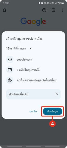 (ตำแหน่งที่ 4) สามารถเลือกช่วงเวลาที่ต้องการล้างข้อมูลได้ จากนั้นคลิกปุ่ม ลบข้อมูลการท่องเว็บ