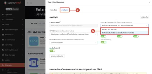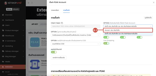 (ตำแหน่งที่ 5) ที่ OPTION สำหรับสินค้าเซ็ต ที่ส่งไป Peak Account คลิกเพื่อเลือกรูปแบบการส่งสินค้าเซ็ต