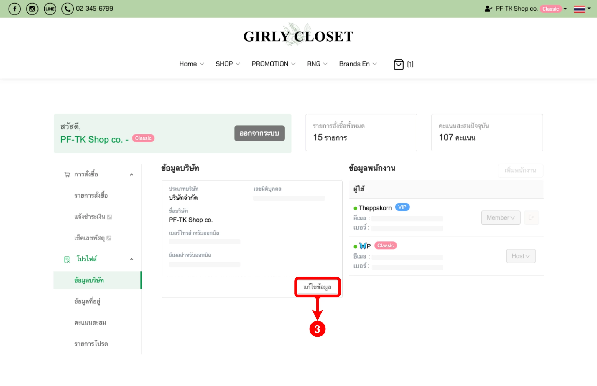 (ตำแหน่งที่ 5) ระบบแสดงหน้าโปรไฟล์บริษัทของลูกค้า คลิกปุ่ม "แก้ไขข้อมูล"