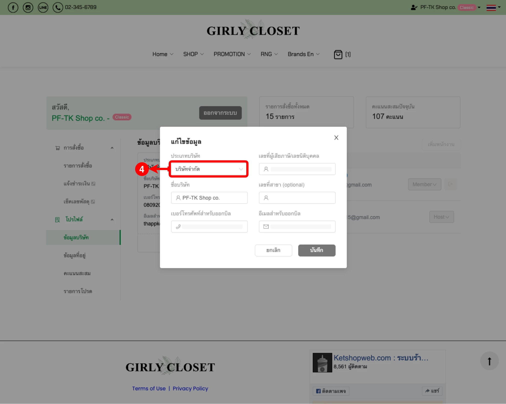 (ตำแหน่งที่ 7) ระบบแสดงดรอปดาวน์ประเภทบริษัท ร้านค้าเลือกประเภทบริษัทตามที่ต้องการ