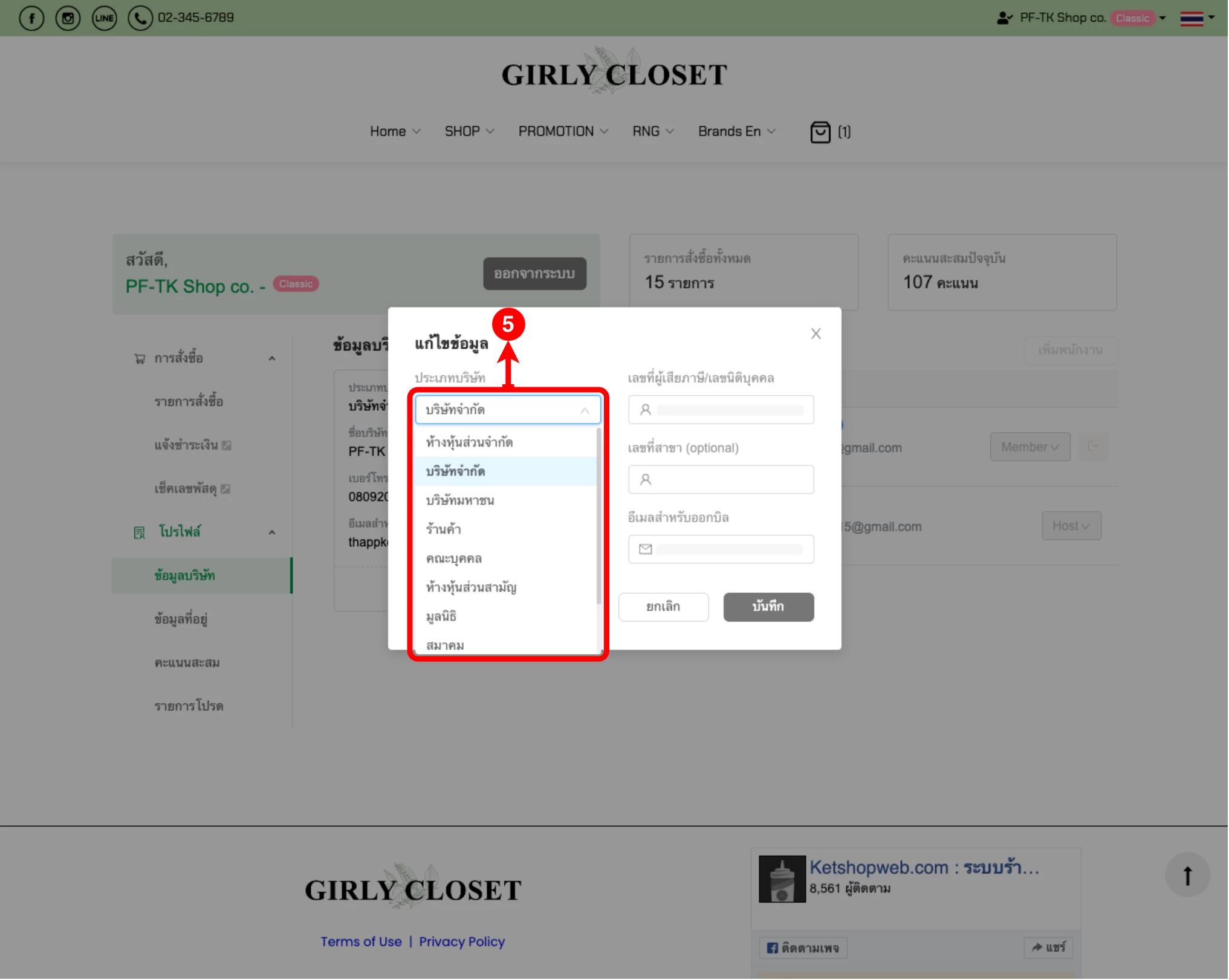 (ตำแหน่งที่ 5) ระบบแสดงดรอปดาวน์ประเภทบริษัท ลูกค้าเลือกประเภทบริษัทตามที่ต้องการ