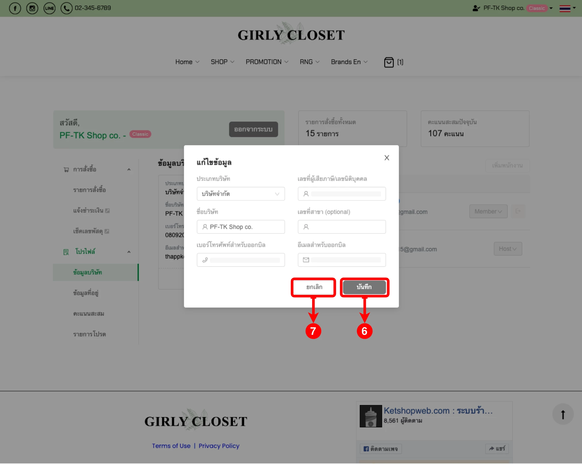 (ตำแหน่งที่ 6) เมื่อเลือกประเภทบริษัทเรียบร้อยแล้ว คลิกปุ่ม “บันทึก”