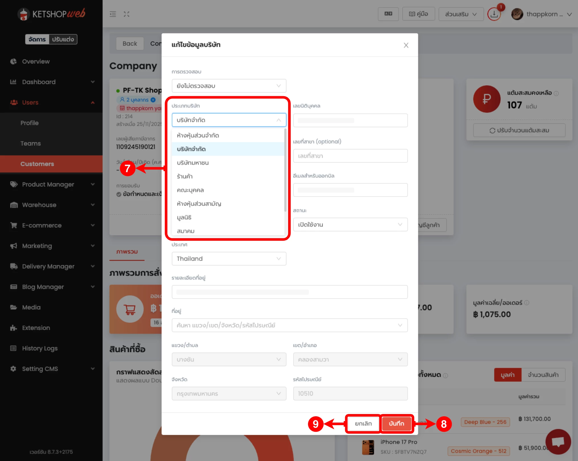 (ตำแหน่งที่ 8) เมื่อเลือกประเภทบริษัทเรียบร้อยแล้ว คลิกปุ่ม 'บันทึก'