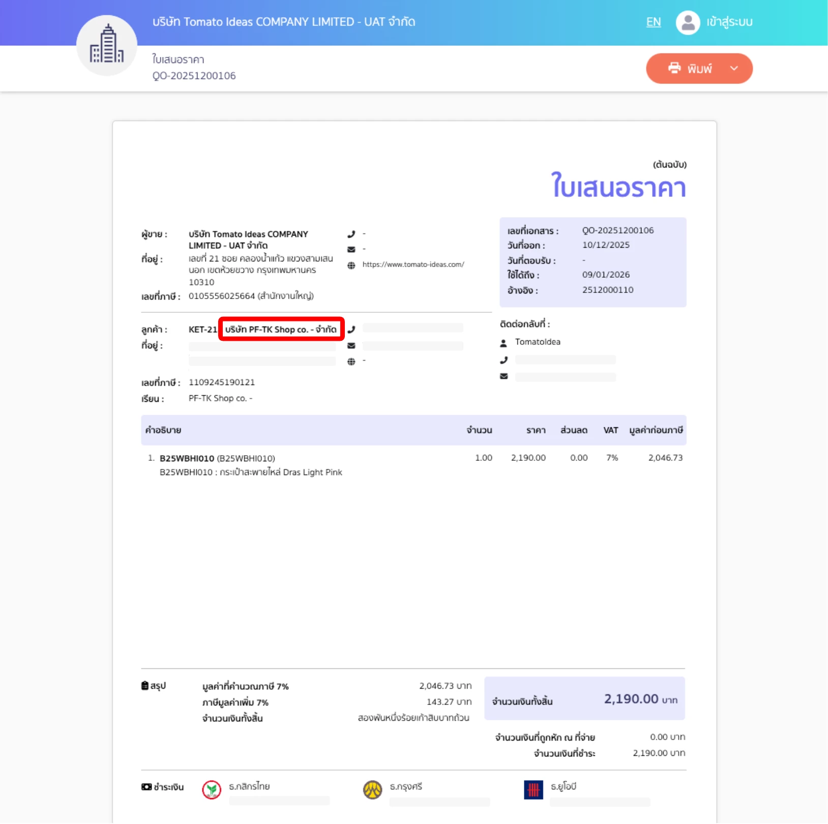 เมื่อลูกค้าทำการสั่งซื้อสินค้าในนามของบริษัท ข้อมูลบริษัท และเอกสารที่เกี่ยวข้องจะถูกส่งไปยัง Peak Accounting โดยระบบจะแสดงข้อมูลใน Peak ตามตัวอย่างดังรูป