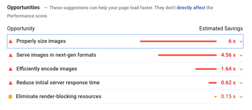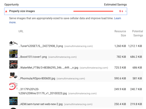 ตามตัวอย่างที่ผมได้ทำการ scan เว็บไซต์จากด้านบน จะพบได้ว่าขนาดของรูปภาพส่งผลทำให้ค่าตัวเลข speed index ไม่ดีนัก จากภาพด้านล่างนี้ ได้บอกว่า ใช้เวลา 6 วินาทีถึงจะโหลดรูปเสร็จทั้งหมดในหน้านี้ พอเรากดแตกออกมามันจะแสดงรายละเอียด URL ไหนให้เราไปทำการเเก้ไขเพื่อลดขนาดไฟล์ได้เลย