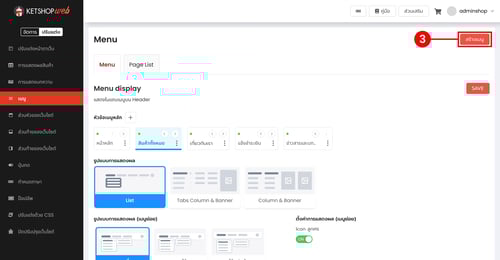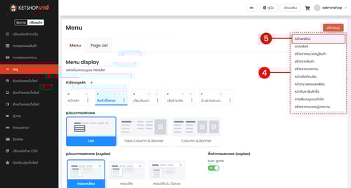 (ตำแหน่งที่ 5) คลิกที่หัวข้อเมนูหลัก เพื่อเลือกรูปแบบการแสดงผลที่ต้องการ โดยในที่นี้จะเลือกตั้งค่าที่เมนู 'Product'