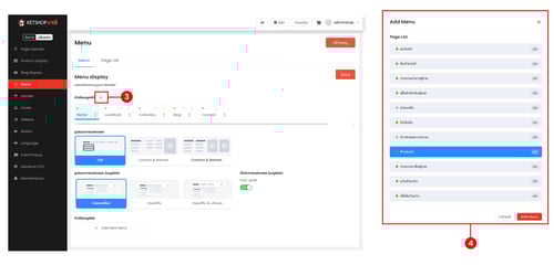(ตำแหน่งที่ 4) จากนั้น จะมีหน้าต่างป๊อปอัปแสดงรายการเมนู (Page List) ขึ้นมา เลือกเมนูที่ต้องการเพิ่ม แล้วคลิก ‘Add Menu’