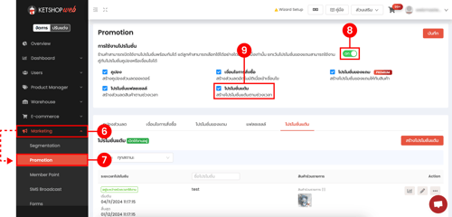 (ตำแหน่งที่ 8) คลิกปุ่ม "on" เพื่อเปิดใช้งานโปรโมชั่น