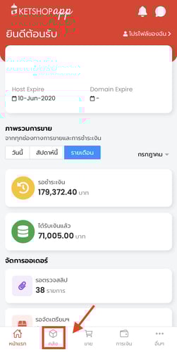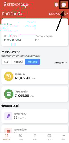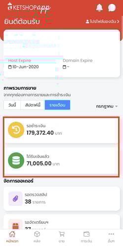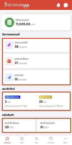 1."หน้าแรก" หน้าต่างแอปพลิเคชั่น Ketshopweb โฉมใหม่ ที่แสดงข้อมูล, รอการชำระเงิน, ได้รับเงินแล้ว, จัดการออเดอร์สมาชิกใหม่และคลังสินค้า