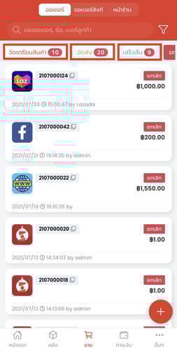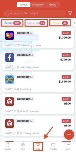 3."หน้าขายสินค้า" เป็นการรวบรวมข้อมูลการขายสินค้า โดยแยกออกเป็นประเภทต่างๆ ได้แก่ สินค้าทั้งหมด, สินค้ารอการชำระเงิน, สินค้าที่ได้จ่ายเงินแล้ว, สินค้าที่รอการจัดเตรียม, สินค้าที่กำลังจัดส่ง, สินค้าที่ทำการจัดส่งแล้ว และสินค้าที่ทำการยกเลิก โดยร้านค้าสามารถเลือกดูสินค้าในแต่ละประเภทได้เลย