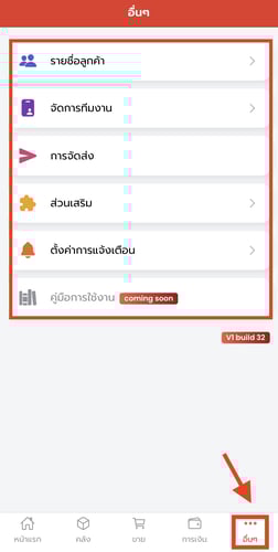 5. "หน้าอื่นๆ" เป็นการรวมรวมข้อมูลการซื้อ-ขาย ทั้งหมด ไม่ว่าจะเป็น รายชื่อลูกค้า, จัดการทีมงาน, การจัดส่ง, ส่วนเสริม และตั้งค่าการแจ้งเตือน
