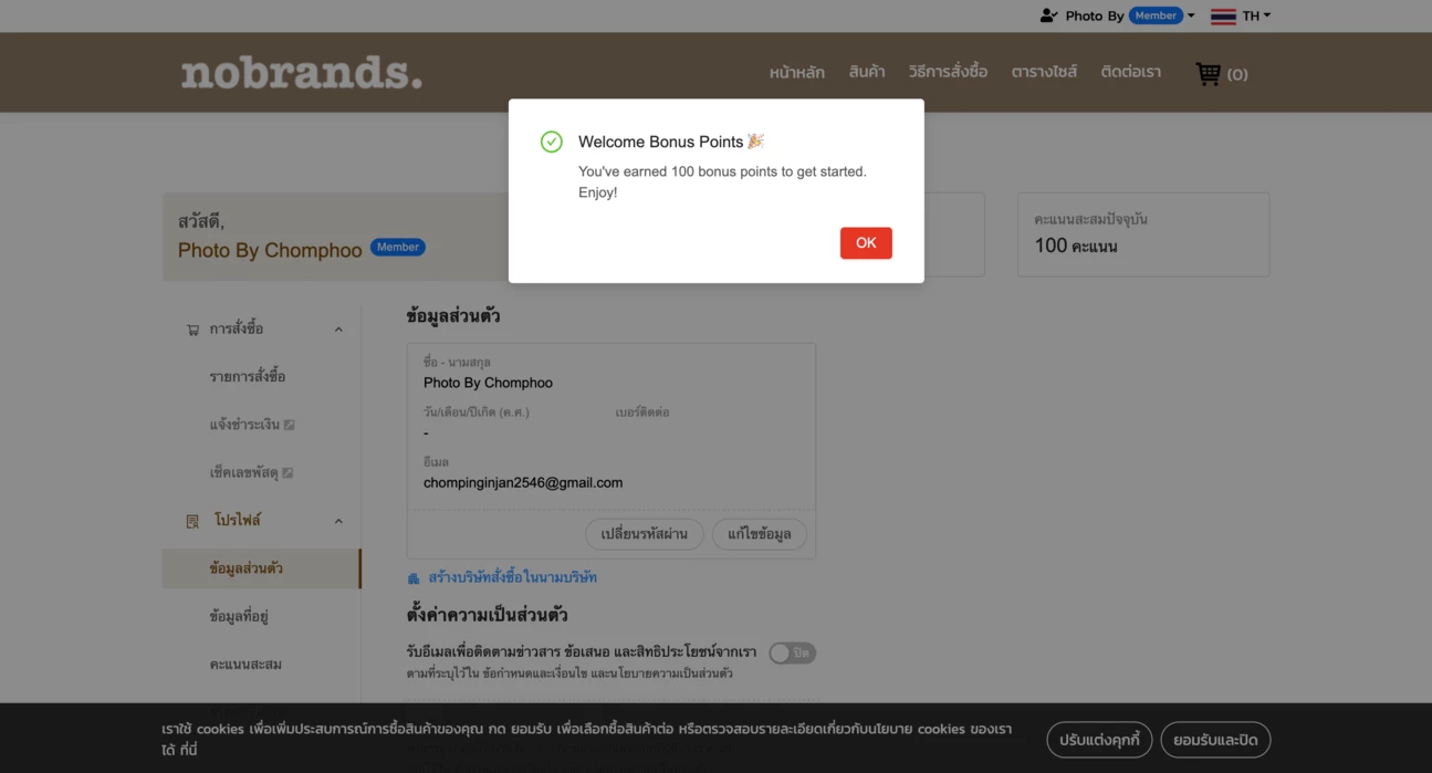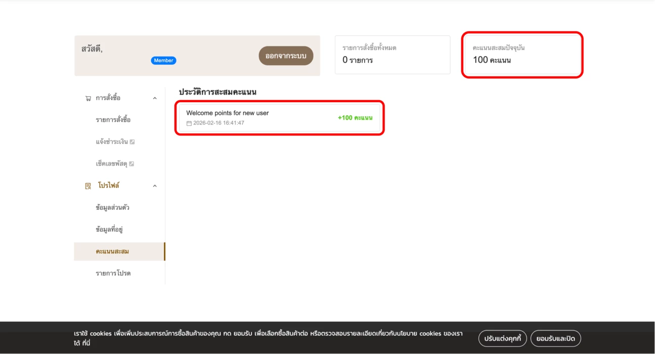 ระบบจะแสดงแต้มต้อนรับที่สมาชิกได้รับ หลังจากสมัครสมาชิกครั้งแรก