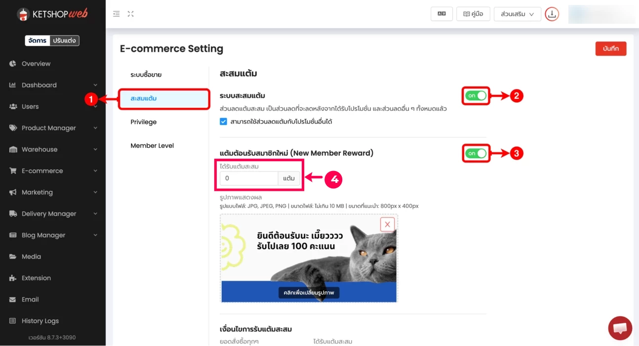 (ตำแหน่งที่ 4) "ระบุจำนวนแต้มสะสม" ที่ต้องการมอบให้สมาชิกใหม่เมื่อสมัครสมาชิกสำเร็จ