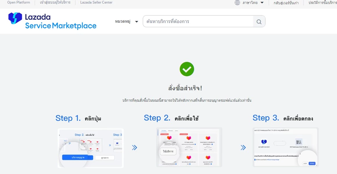 ดำเนินการชำระเงินกับทาง Lazada เมื่อทำรายการเรียบร้อย ระบบจะแสดงหน้า 'สั่งซื้อสำเร็จ'