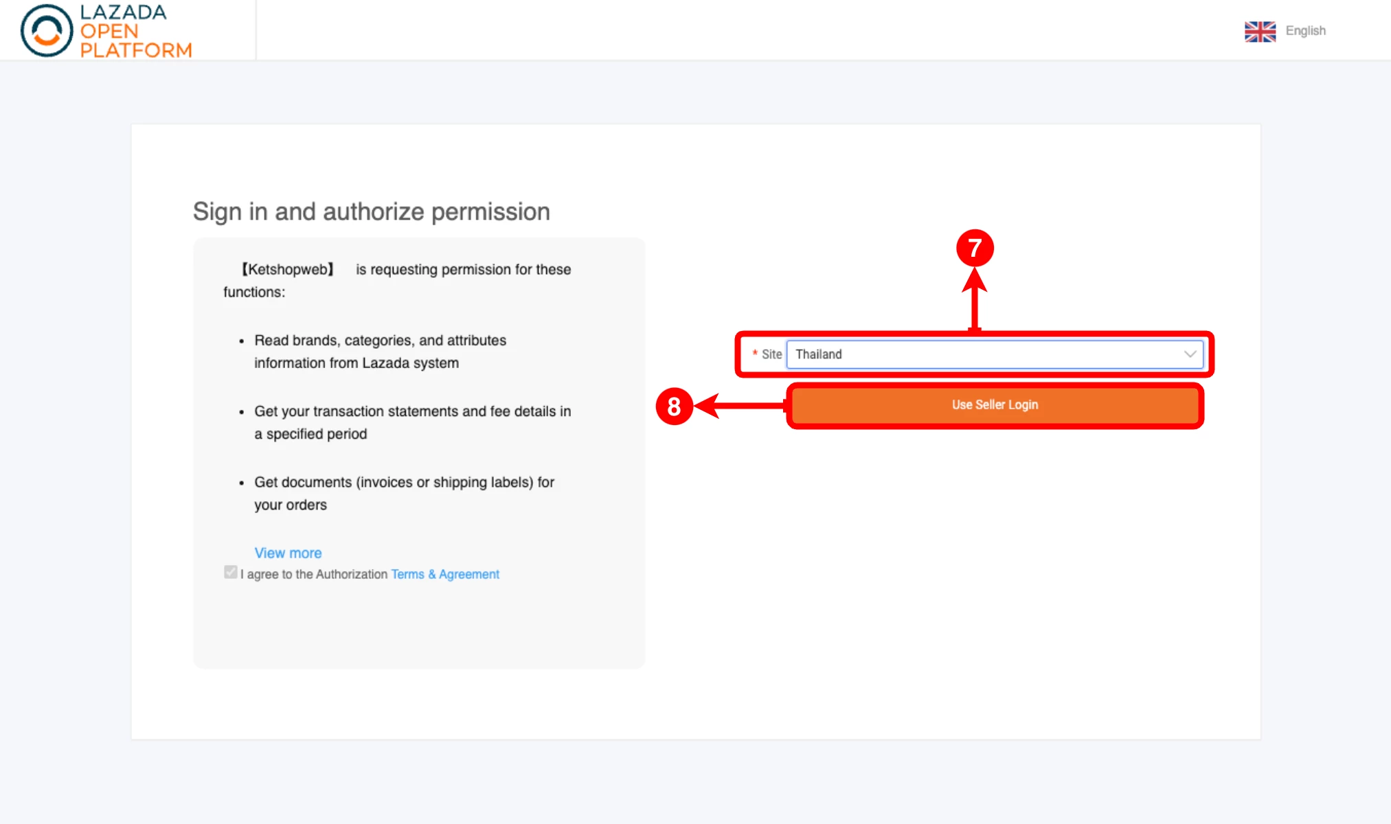 หลังจากคลิกปุ่ม 'เห็นด้วย' ระบบจะนำท่านไปยังหน้า Authorization เพื่อดำเนินการเชื่อมต่อระหว่าง Lazada และ Ketshopweb