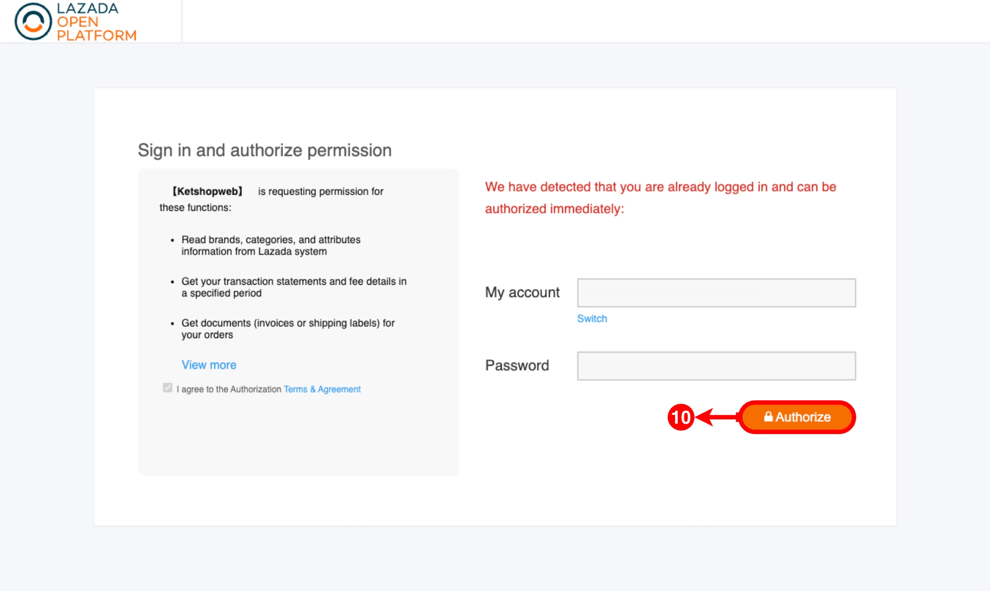(ตำแหน่งที่ 10) คลิกปุ่ม 'Authorize'
