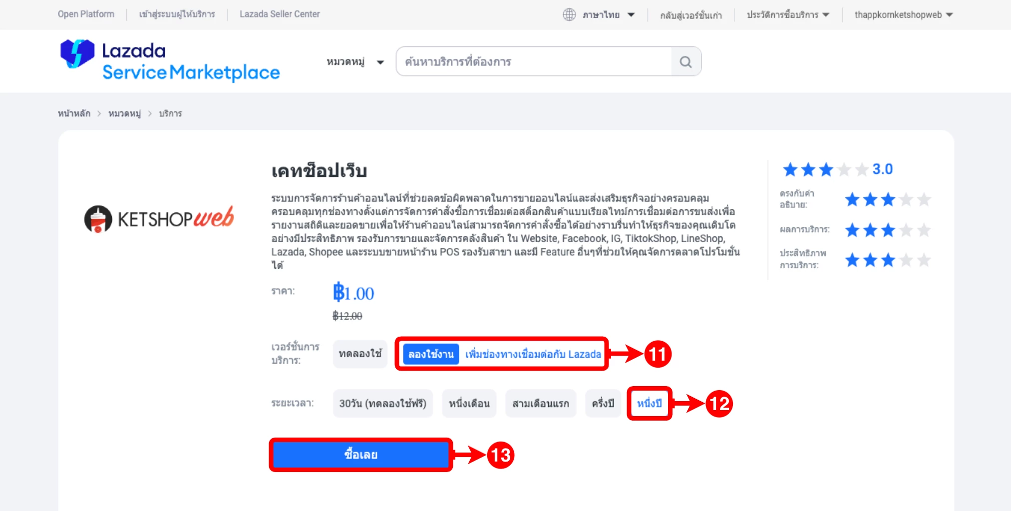 (ตำแหน่งที่ 11) เลือกเวอร์ชันการให้บริการเป็น 'ลองใช้งาน เพื่มช่องทางเชื่อมต่อกับ Lazada'