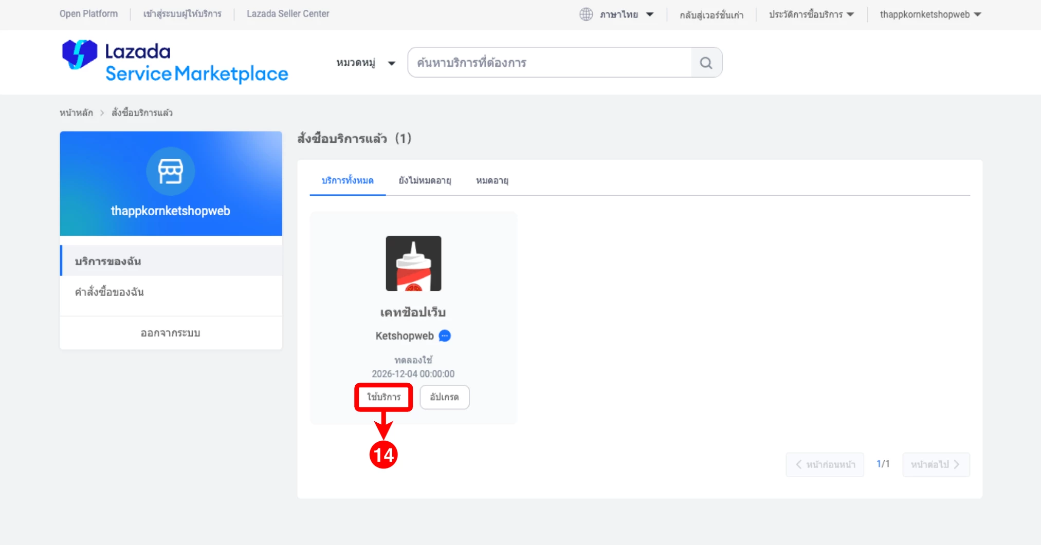 (ตำแหน่งที่ 14) ระบบจะนำท่านไปยังหน้า บริการของฉัน หรือสามารถเข้าใช้งานผ่านลิงก์ที่กำหนด จากนั้นไปที่แท็บ บริการทั้งหมด แล้วเลือก Ketshopweb และคลิกปุ่ม 'ใช้บริการ'
