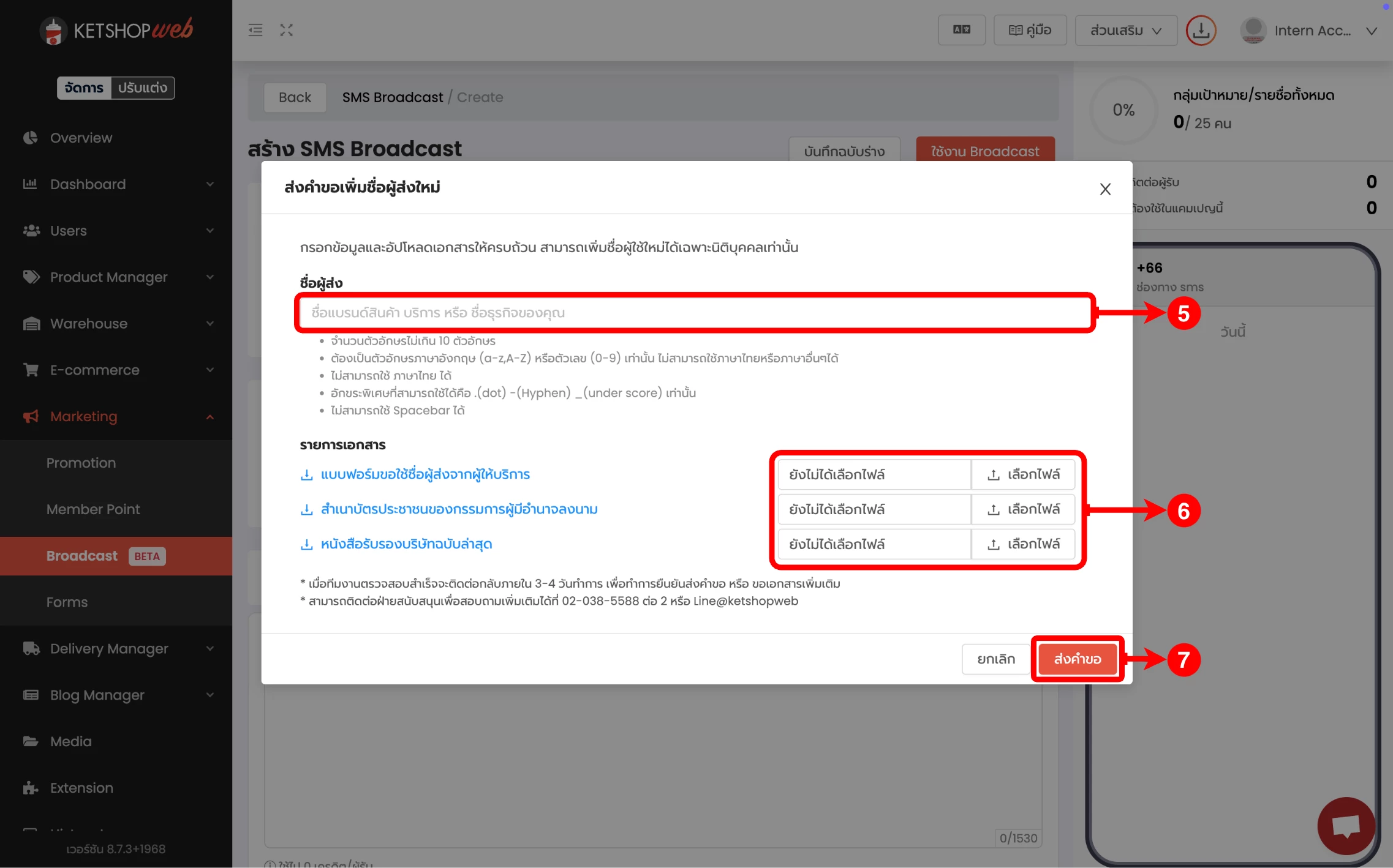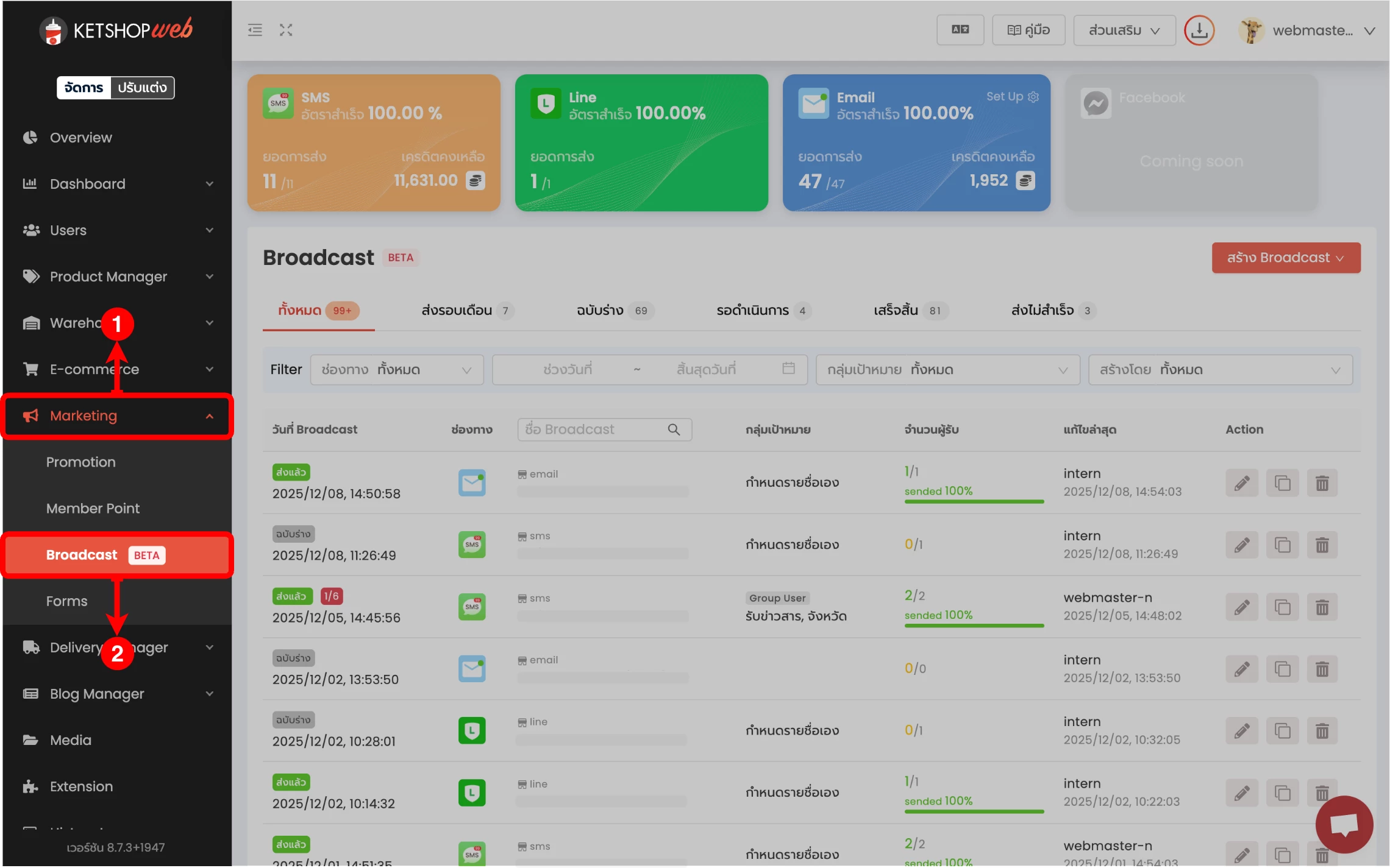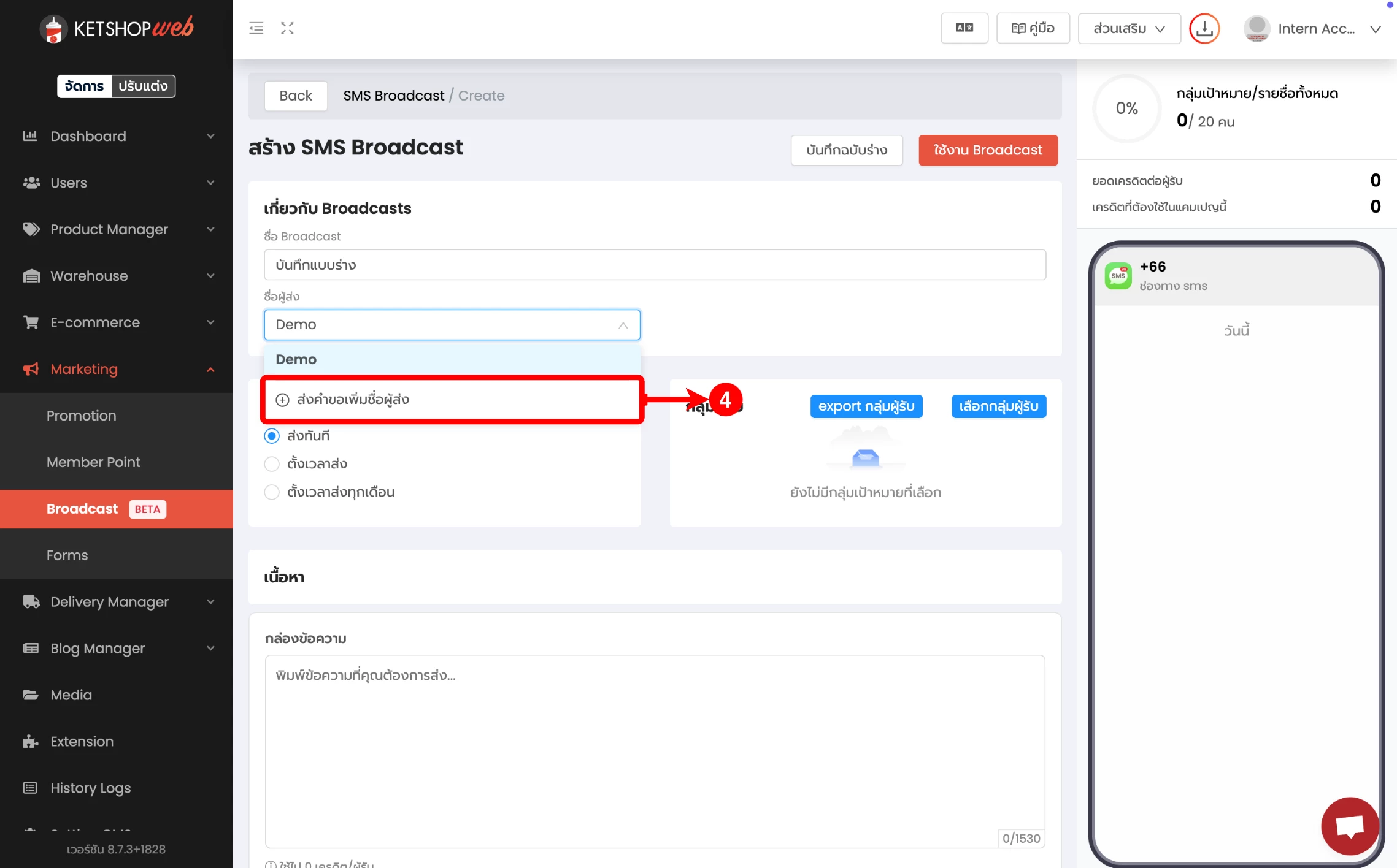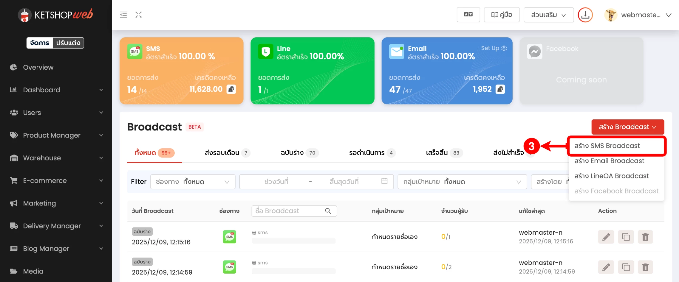 (ตำแหน่งที่ 3) คลิก 'สร้าง Broadcast' แล้วเลือก 'สร้าง SMS Broadcast'