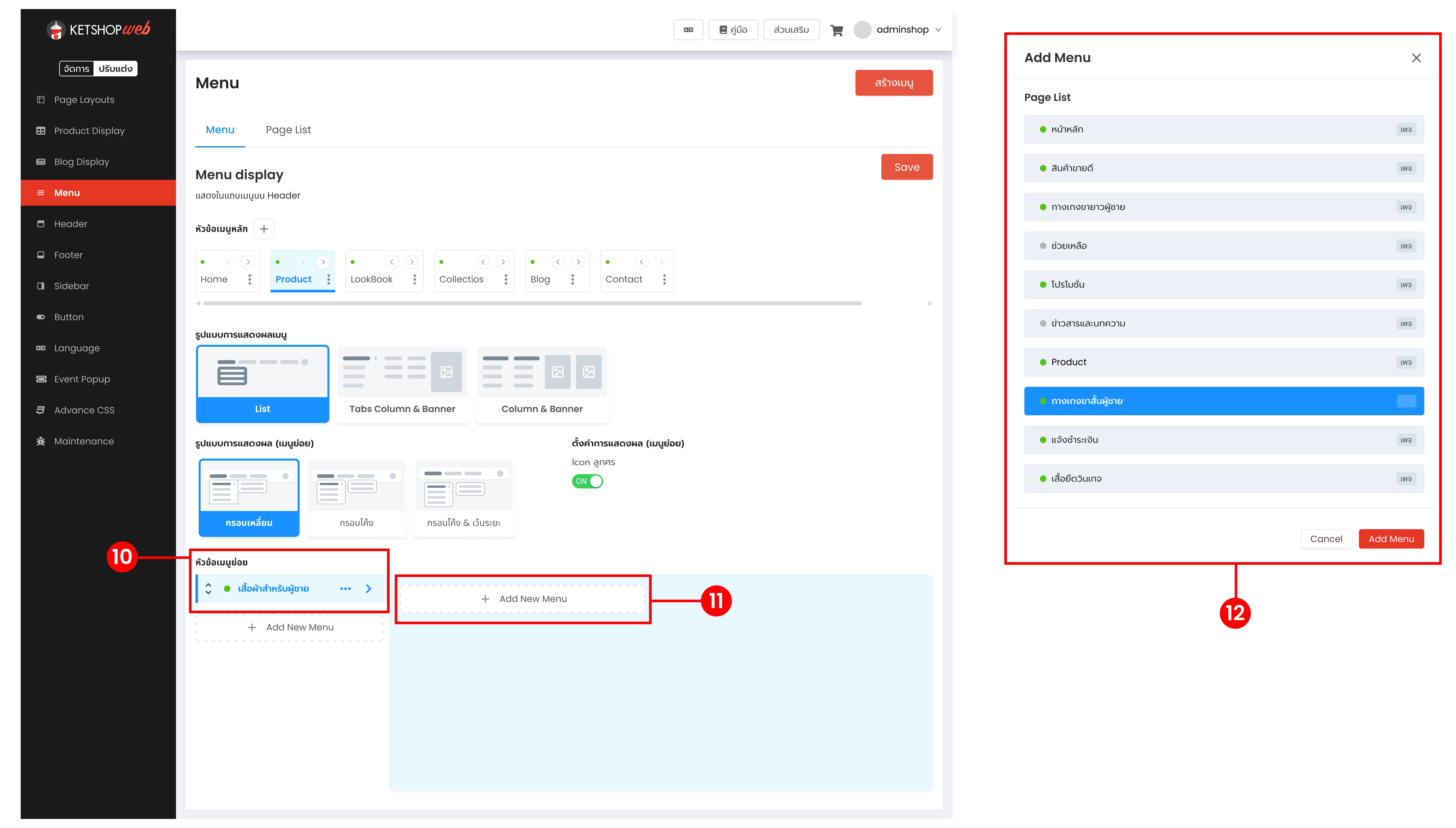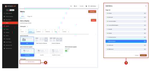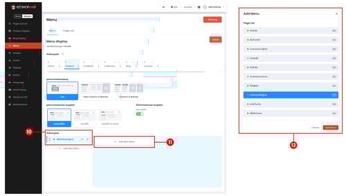(ตำแหน่งที่ 12) จากนั้นจะมีหน้าต่างป๊อปอัปแสดงรายการหน้า (Page List) ขึ้นมา ให้เลือกหน้าที่ต้องการ แล้วคลิก ‘Add Menu’ เพื่อเพิ่มเมนูย่อยดังกล่าว