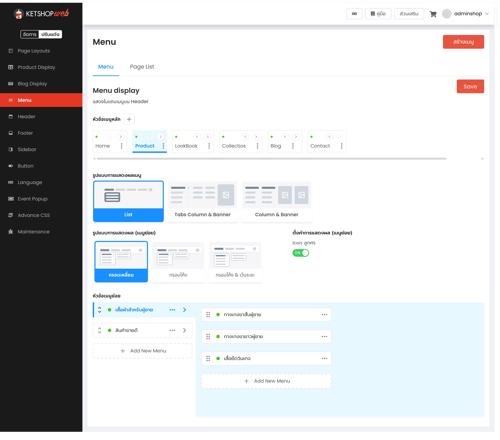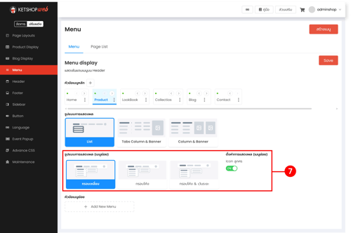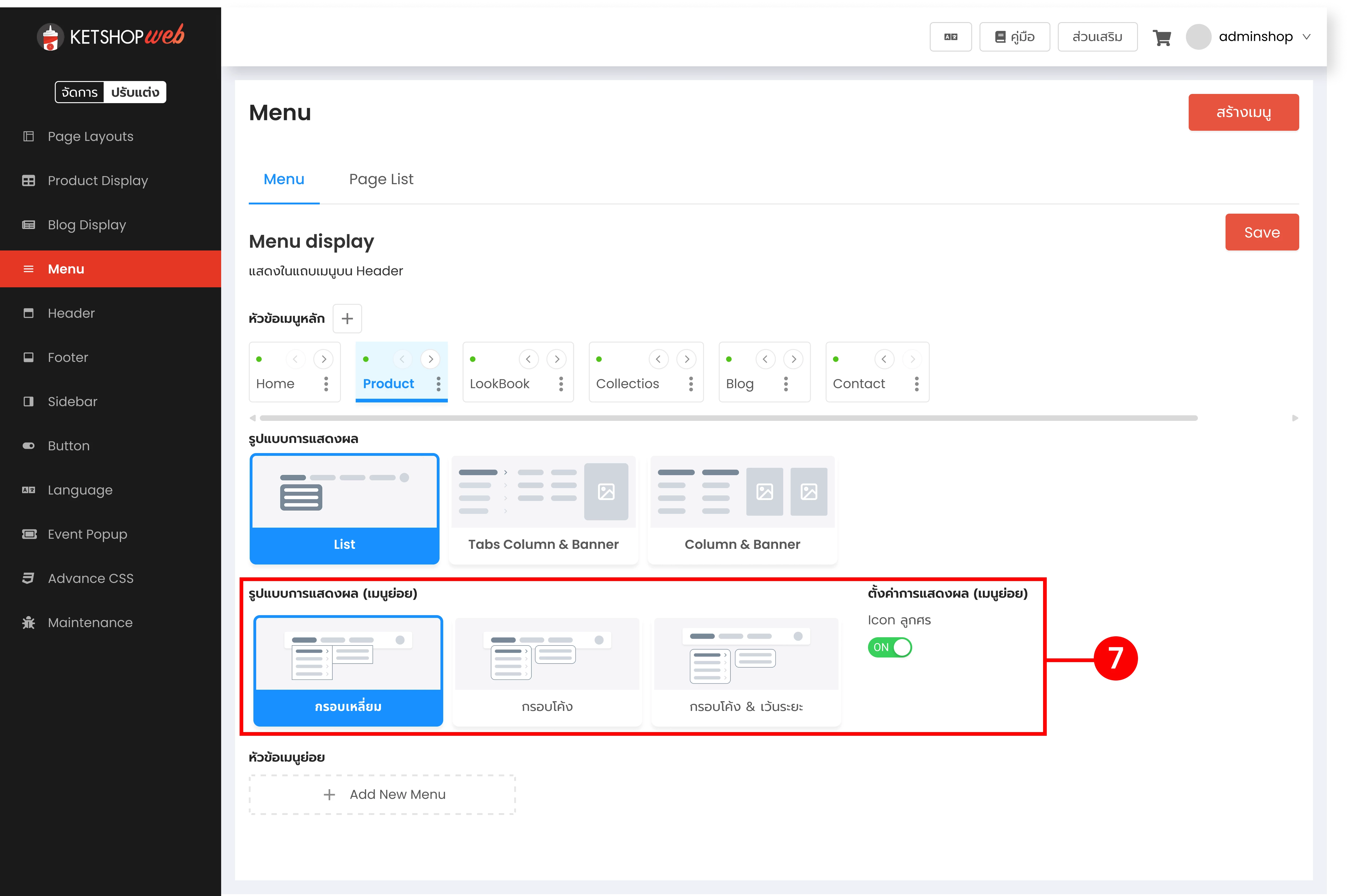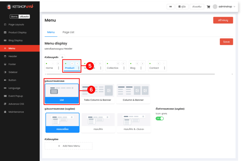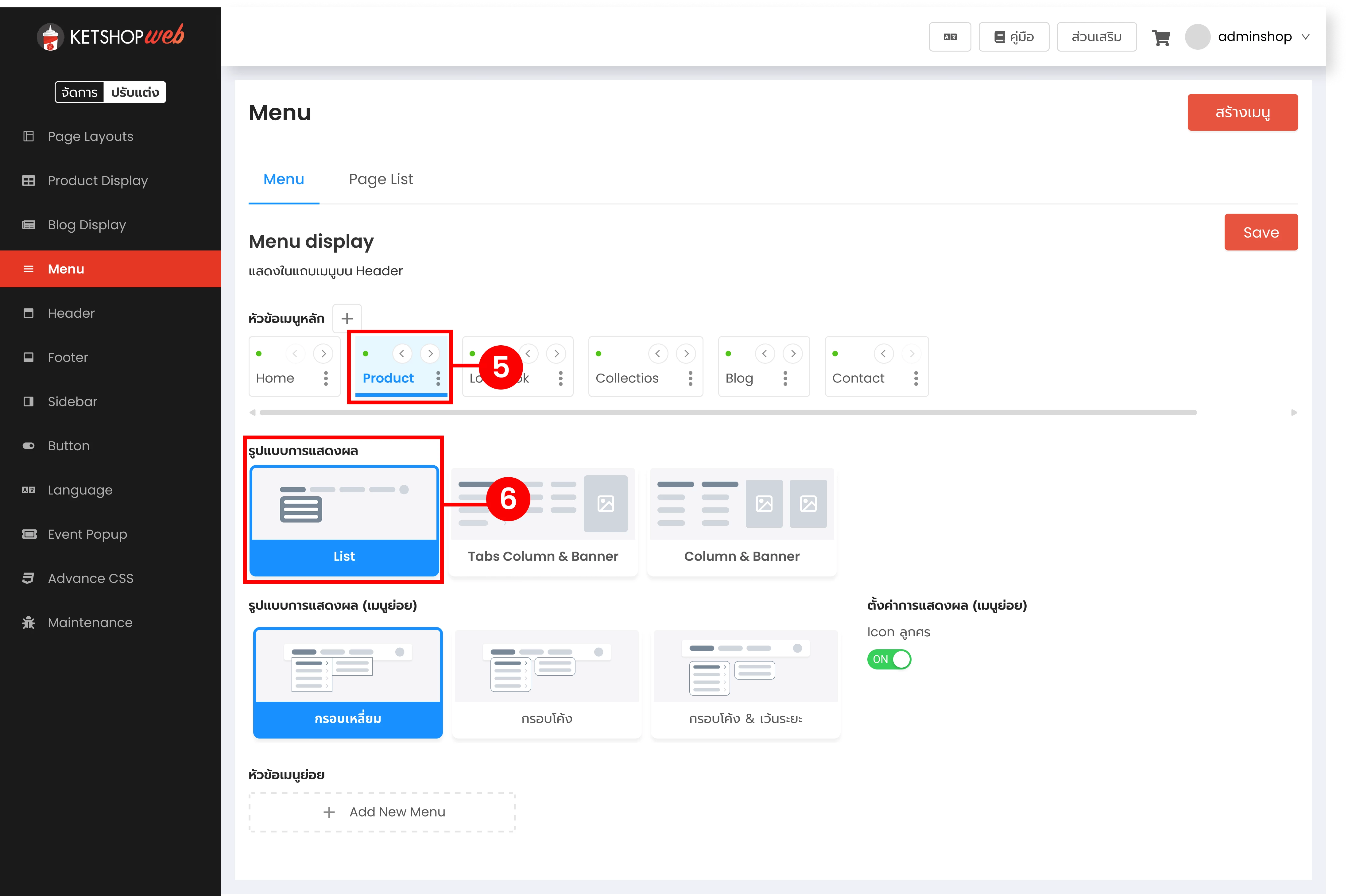 (ตำแหน่งที่ 5) คลิกเพื่อเลือกเมนูหลักที่ต้องการตั้งค่า โดยในที่นี้จะเลือกตั้งค่าที่ เมนู “Product”