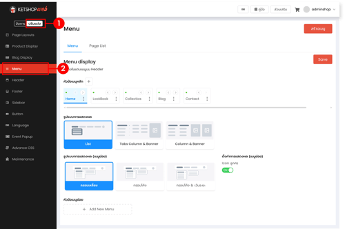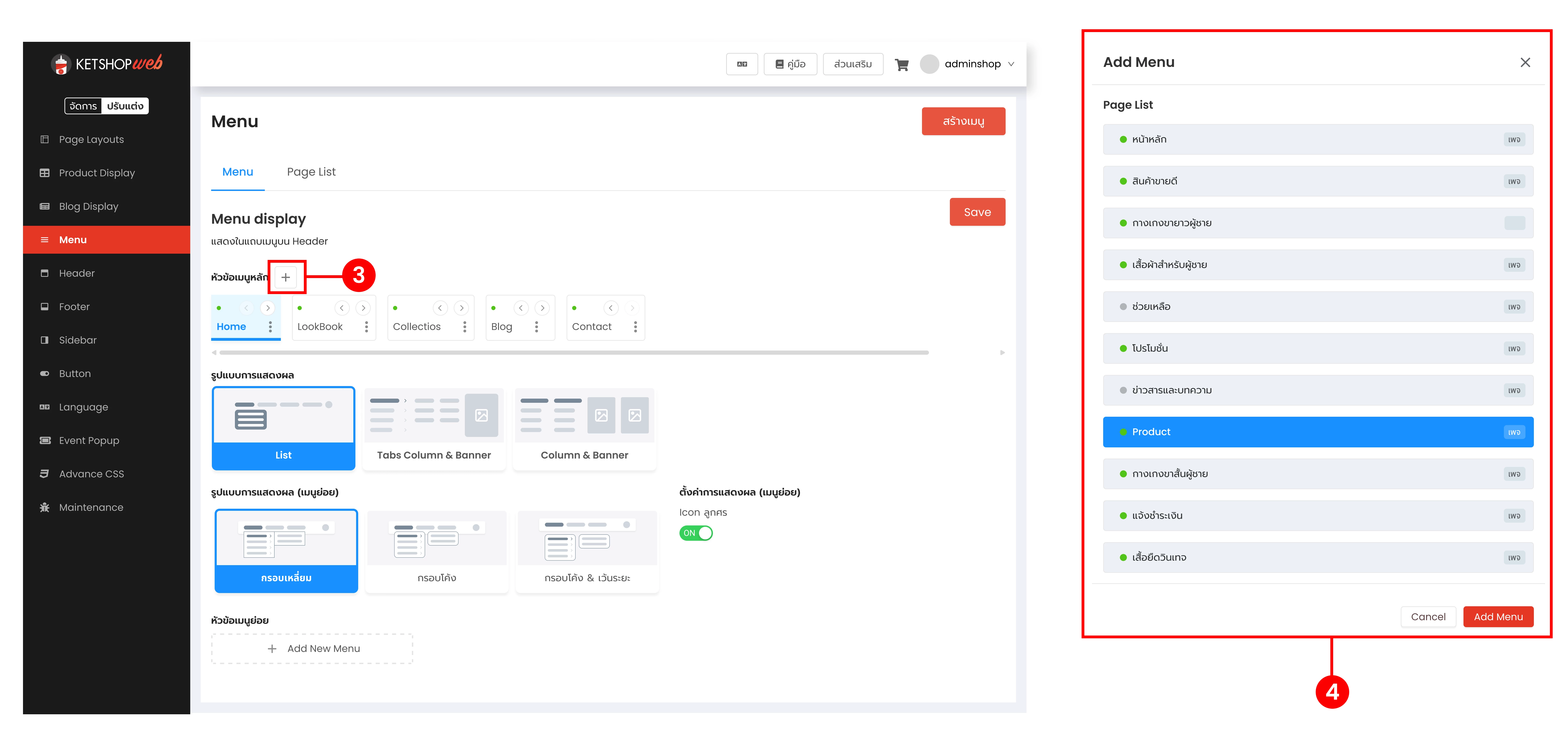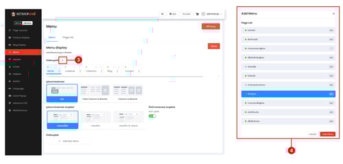 (ตำแหน่งที่ 4) จากนั้นจะมีหน้าต่างป๊อปอัปแสดงรายการหน้า (Page List) ขึ้นมา ให้เลือกหน้าที่ต้องการ แล้วคลิก ‘Add Menu’ เพื่อเพิ่มเมนูหลักดังกล่าว
