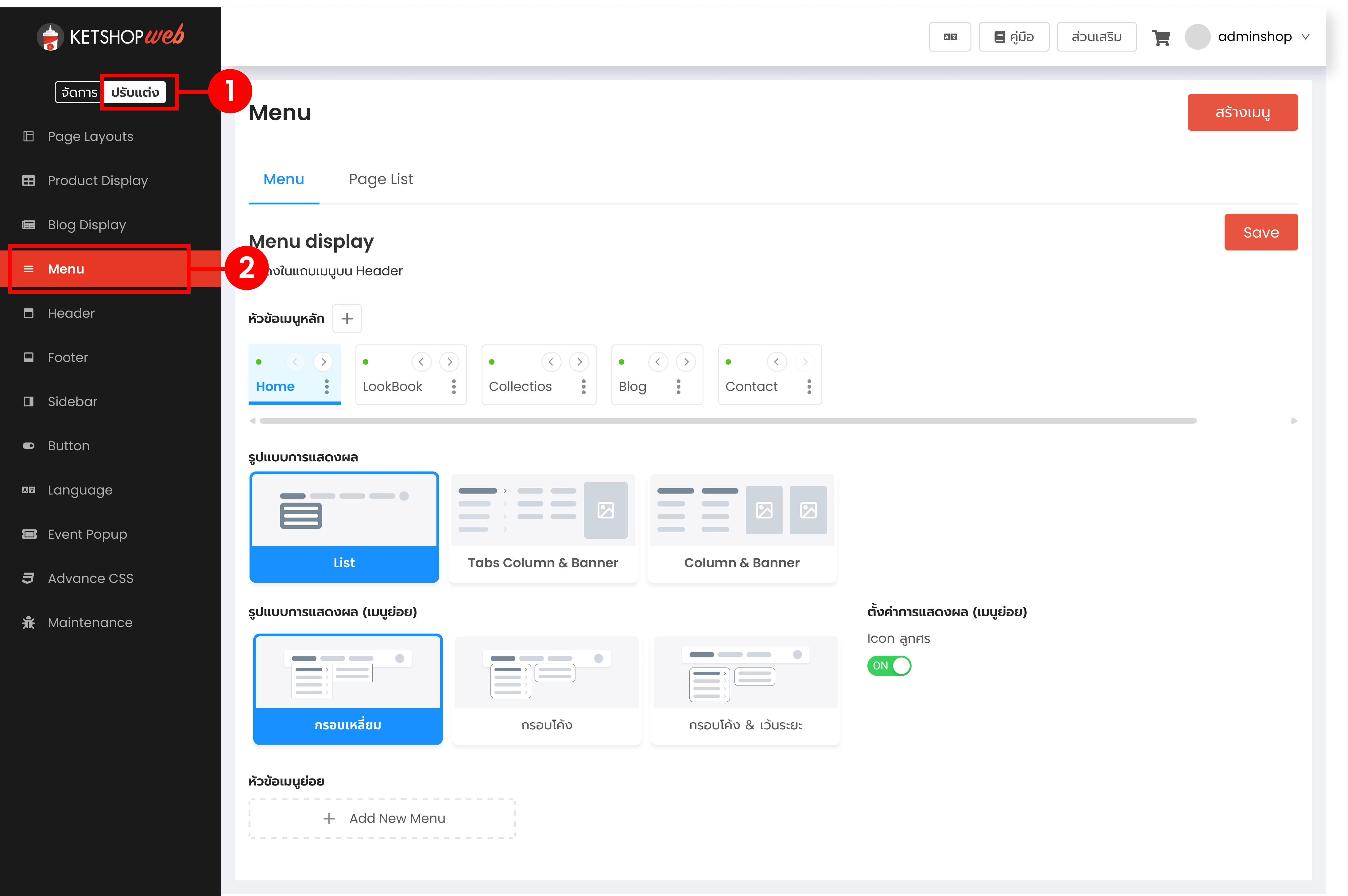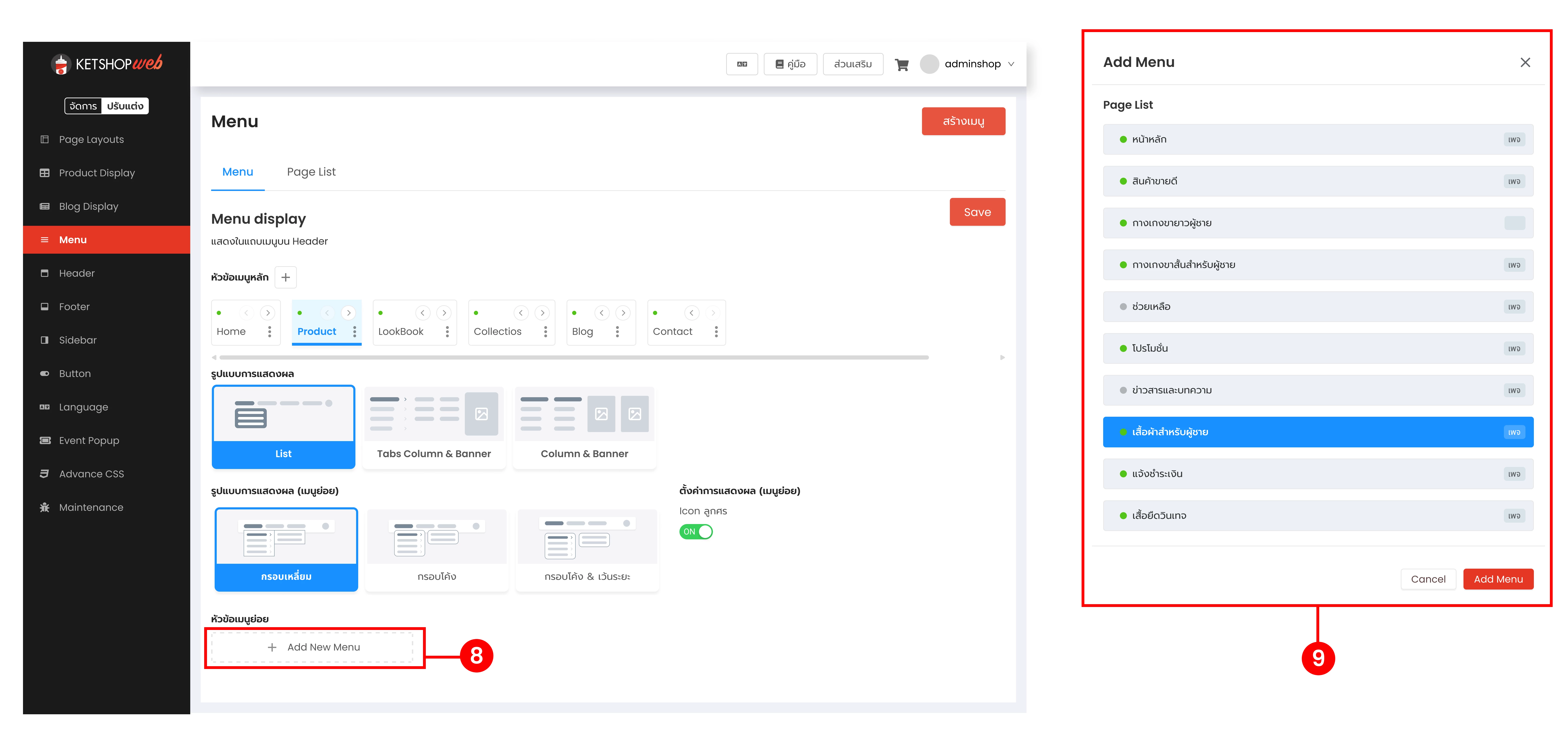 (ตำแหน่งที่ 9) จากนั้นจะมีหน้าต่างป๊อปอัปแสดงรายการหน้า (Page List) ขึ้นมา ให้เลือกหน้าที่ต้องการ แล้วคลิก ‘Add Menu’ เพื่อเพิ่มเมนูย่อยดังกล่าว