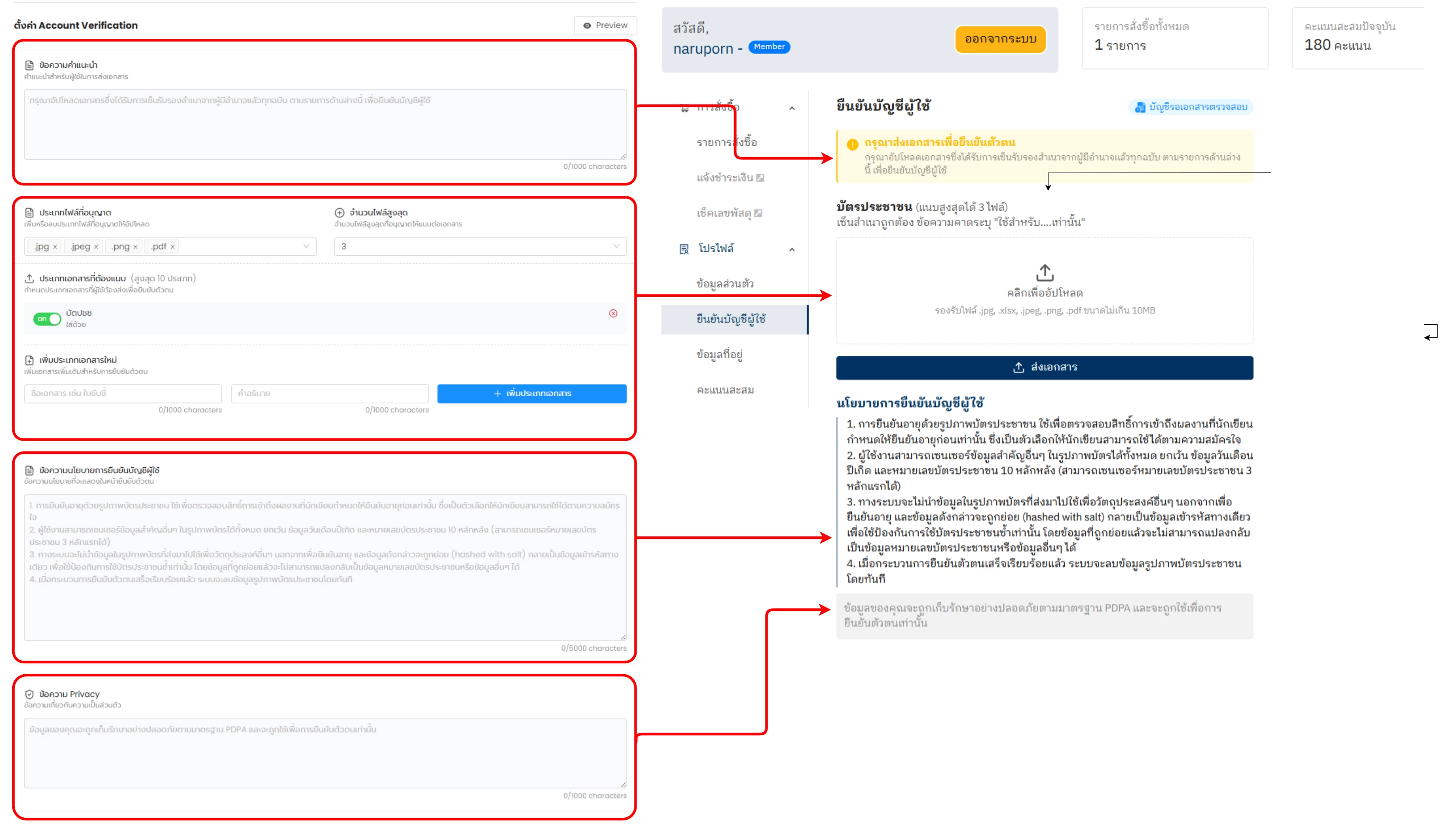 นอกเหนือจากการควบคุมสิทธิ์การแสดงหน้าเว็บโดยอิงเมนู หรือตามระดับ Member level แล้ว หากเปิดใช้งาน Account Verification ร่วมด้วย ผู้ใช้งานที่ได้รับสิทธิ์ในการเข้าถึงหน้าเพจ จะยังไม่สามารถมองเห็นเมนูได้ทันที โดยจะต้องทำการอัปโหลดเอกสาร (ตามที่ร้านกำหนด) เพื่อยืนยันตัวตนบัญชี จึงจะสามารถมองเห็นเมนูดังกล่าวได้