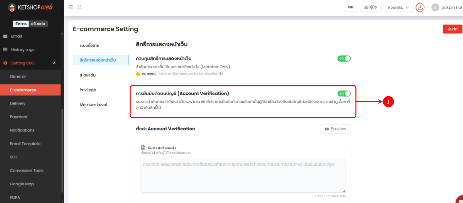 ( ตำแหน่งที่ 1) สามารถตั้งค่าได้ที่ จัดการ → Setting CMS→ E-commerce → สิทธิ์การแสดงหน้าเว็บ → การยืนยันตัวตนบัญชี