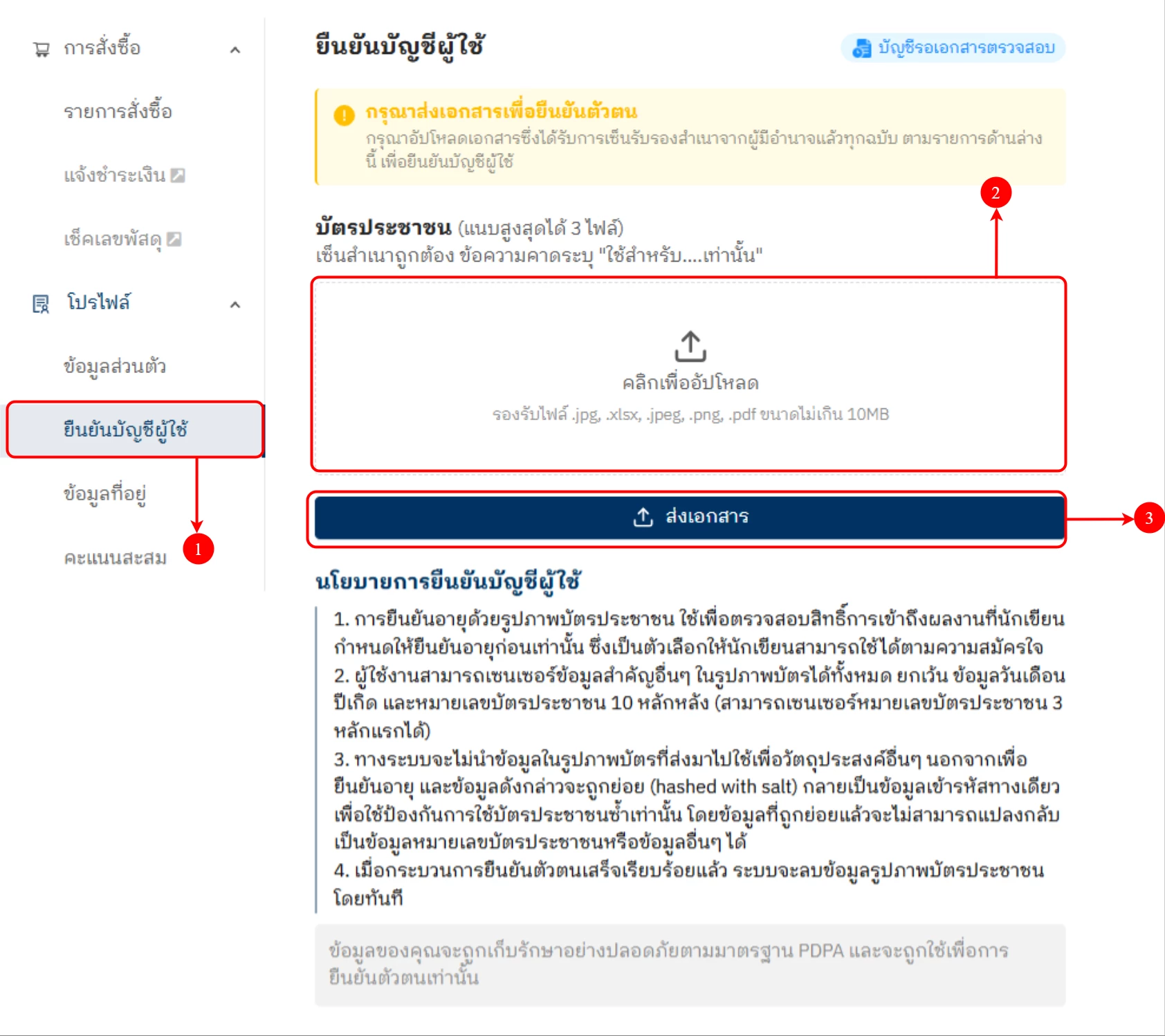 (ตำแหน่งที่ 3 ) คลิกแถบ "เอกสารยืนยันบัญชี"