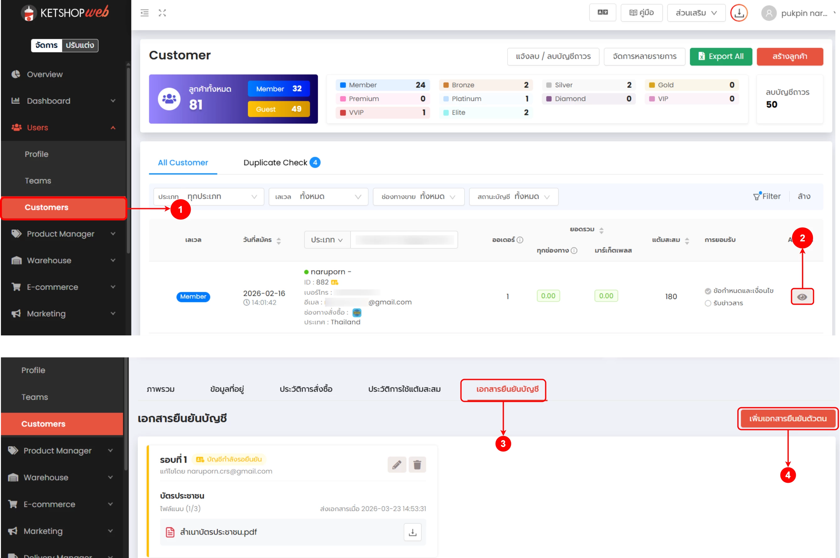 (ตำแหน่งที่ 1 ) จัดการ → Customer เลือกรายชื่อลูกค้าที่ต้องการเพิ่มเอกสารยืนยันตัวตน