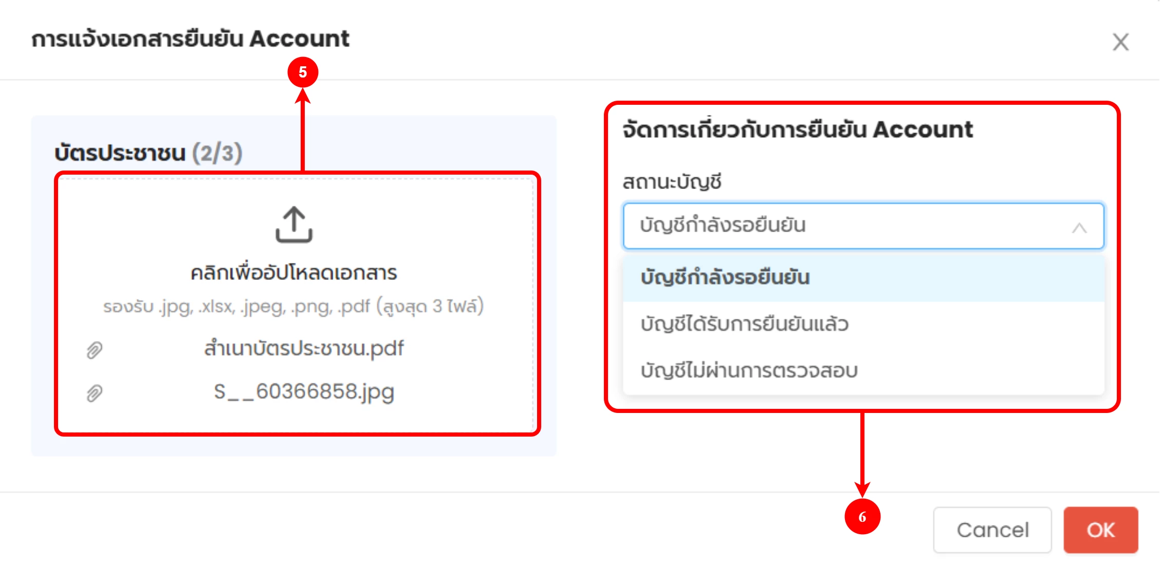 (ตำแหน่งที่ 6 ) เลือกสถานะบัญชี หากเอกสารครบถ้วนไม่ต้องทำการแนบเอกสาร ตรวจสอบ และเปลี่ยนสถานะบัญชีได้เลย