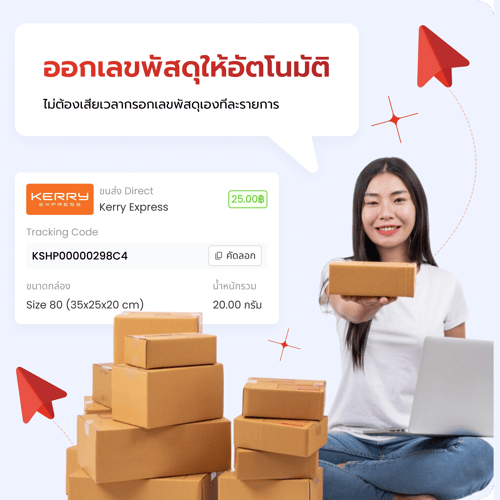 ไม่ต้องเสียเวลากรอกเลขพัสดุเองทีละรายการ เพราะระบบ สามารถออกเลขพัสดุให้เองเมื่อมีการสั่งซื้อจากลูกค้า หรือเมื่อร้านค้าทำการจัดส่ง