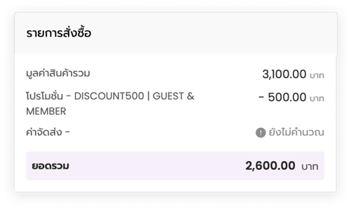 สามารถกำหนดเงื่อนไขส่วนลดเป็นบาทหรือเปอร์เซ็นต์ได้ เมื่อการสั่งซื้อเข้าเงื่อนไขระบบจะทำการเพิ่มส่วนลดให้เองโดยอัตโนมัติ